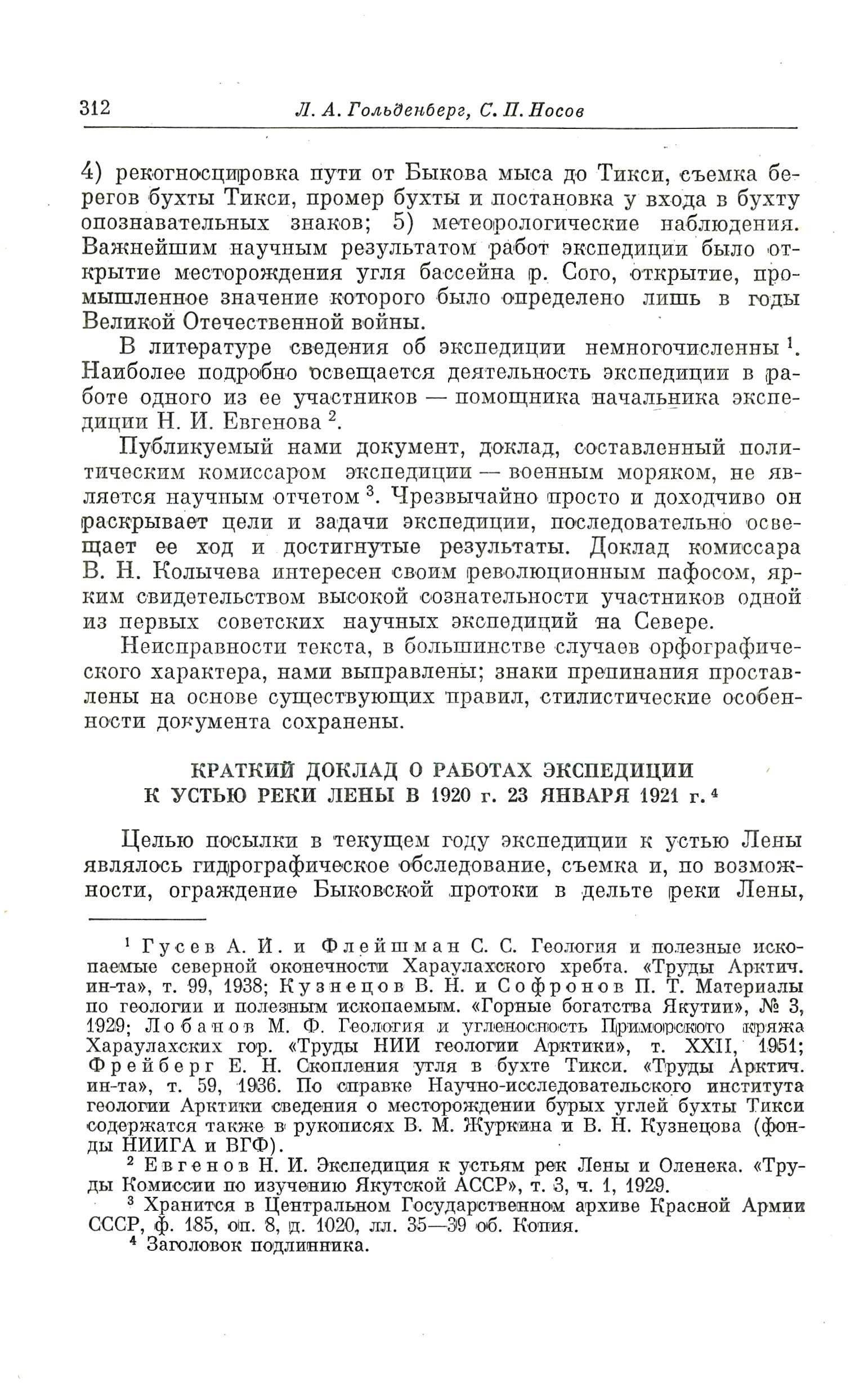 Публикуемый нами документ, доклад, составленный политическим комиссаром экспедиции — военным моряком, не является научным отчетом {3}. Чрезвычайно просто и доходчиво он раскрывает цели и задачи экспедиции, последовательно освещает ее ход и достигнутые результаты. Доклад комиссара В. Н. Колычева интересен своим революционным пафосом, ярким свидетельством высокой сознательности участников одной из первых советских научных экспедиций на Севере.