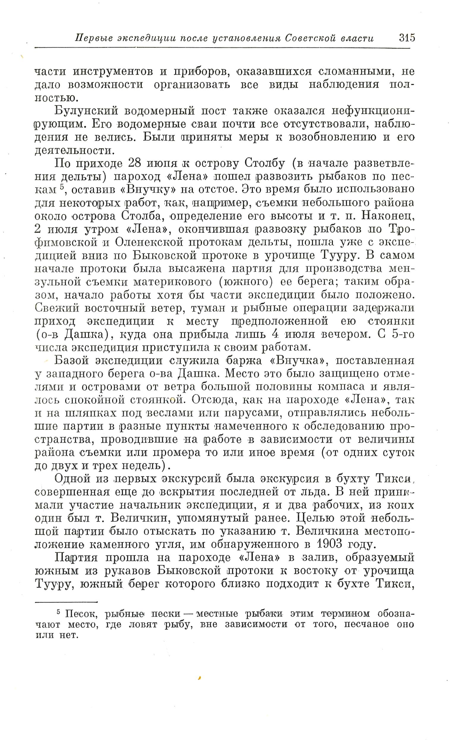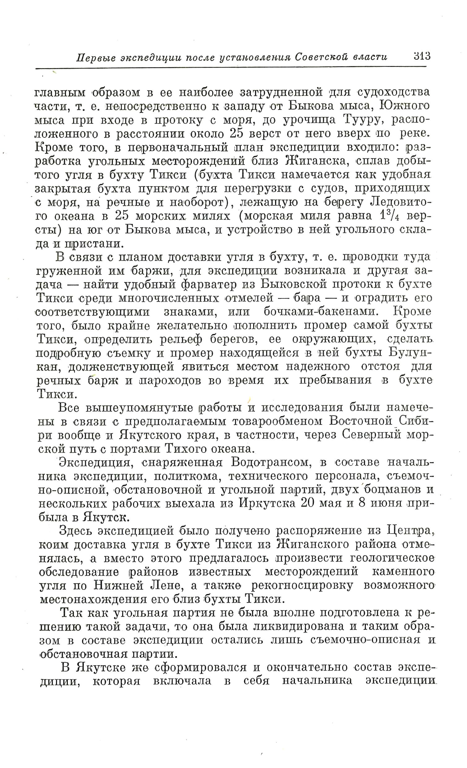 главным образом в ее наиболее затрудненной для судоходства части, т. е. непосредственно к западу от Быкова мыса, Южного мыса при входе в протоку с моря, до урочища Тууру, расположенного в расстоянии около 25 верст от него вверх по реке. Кроме того, в первоначальный план экспедиции входило: разработка угольных месторождений близ Жиганска, сплав добытого угля в бухту Тикси (бухта Тикси намечается как удобная закрытая бухта пунктом для перегрузки с судов, приходящих с моря, на речные и наоборот), лежащую на берегу Ледовитого океана в 25 морских милях (морская миля равна 1 3/4 версты) на юг от Быкова мыса, и устройство в ней угольного склада и пристани.