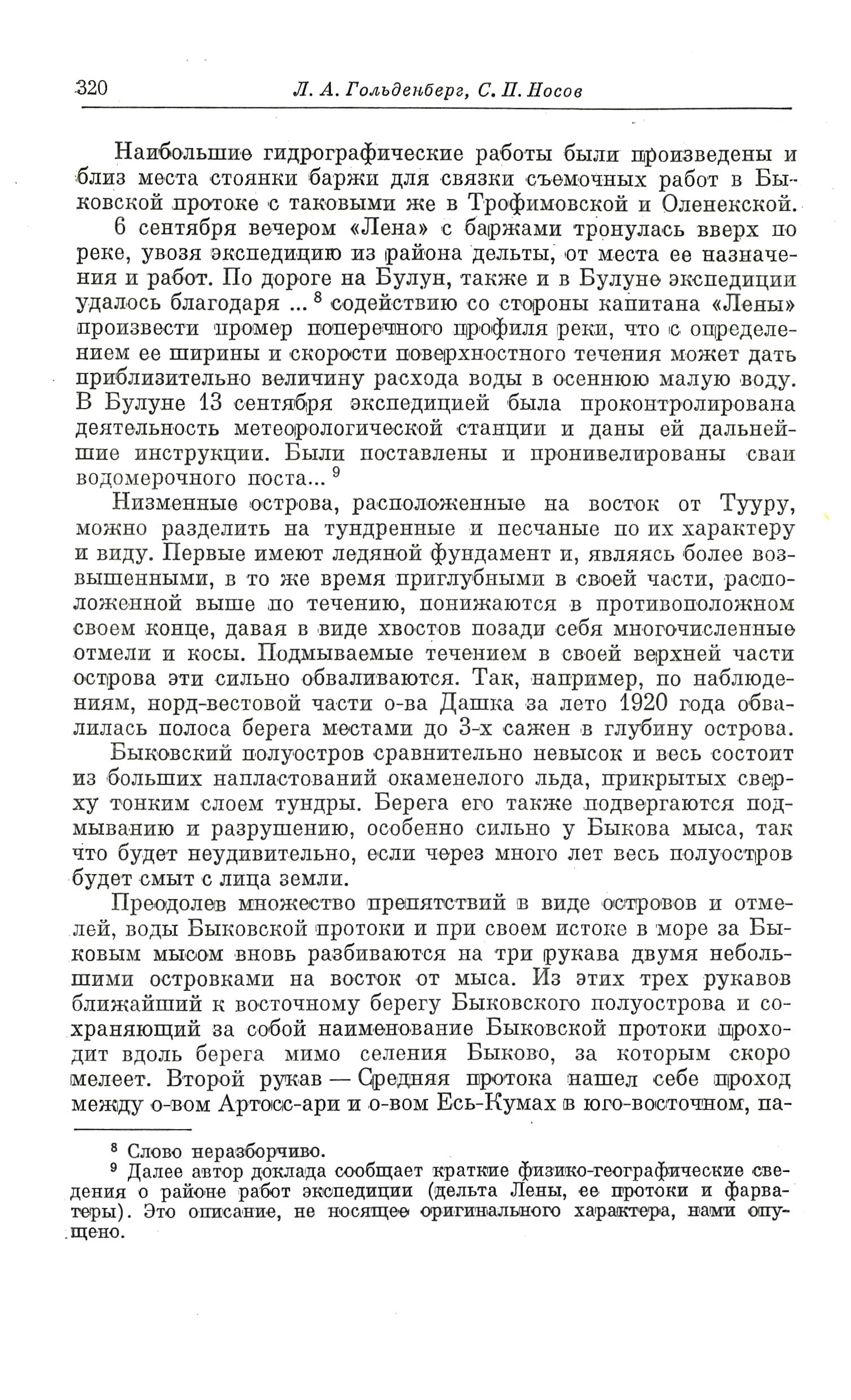 {9} Далее автор доклада сообщает краткие физико-географические сведения о районе работ экспедиции (дельта Лены, ее протоки и фарватеры). Это описание, не носящее оригинального характера, нами опущено.