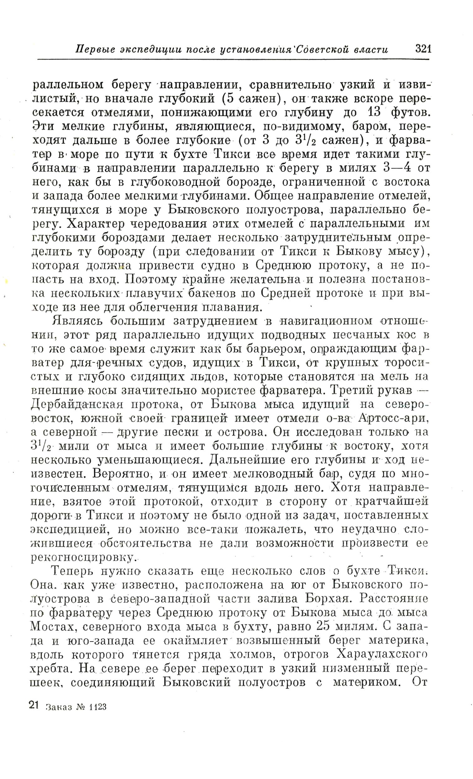 раллельном берегу направлении, сравнительно узкий и извилистый, но вначале глубокий (5 сажен), он также вскоре пересекается отмелями, понижающими его глубину до 13 футов. Эти мелкие глубины, являющиеся, по-видимому, баром, переходят дальше в более глубокие (от 3 до З 1/2 сажен), и фарватер в море по пути к бухте Тикси все время идет такими глубинами в направлении параллельно к берегу в милях 3—4 от него, как бы в глубоководной борозде, ограниченной с востока и запада более мелкими глубинами. Общее направление отмелей, тянущихся в море у Быковского полуострова, параллельно берегу. Характер чередования этих отмелей с параллельными им глубокими бороздами делает несколько затруднительным определить ту борозду (при следовании от Тикси к Быкову мысу), которая должна привести судно в Среднюю протоку, а не попасть на вход. Поэтому крайне желательна и полезна постановка нескольких плавучих бакенов по Средней протоке и при выходе из нее для облегчения плавания.