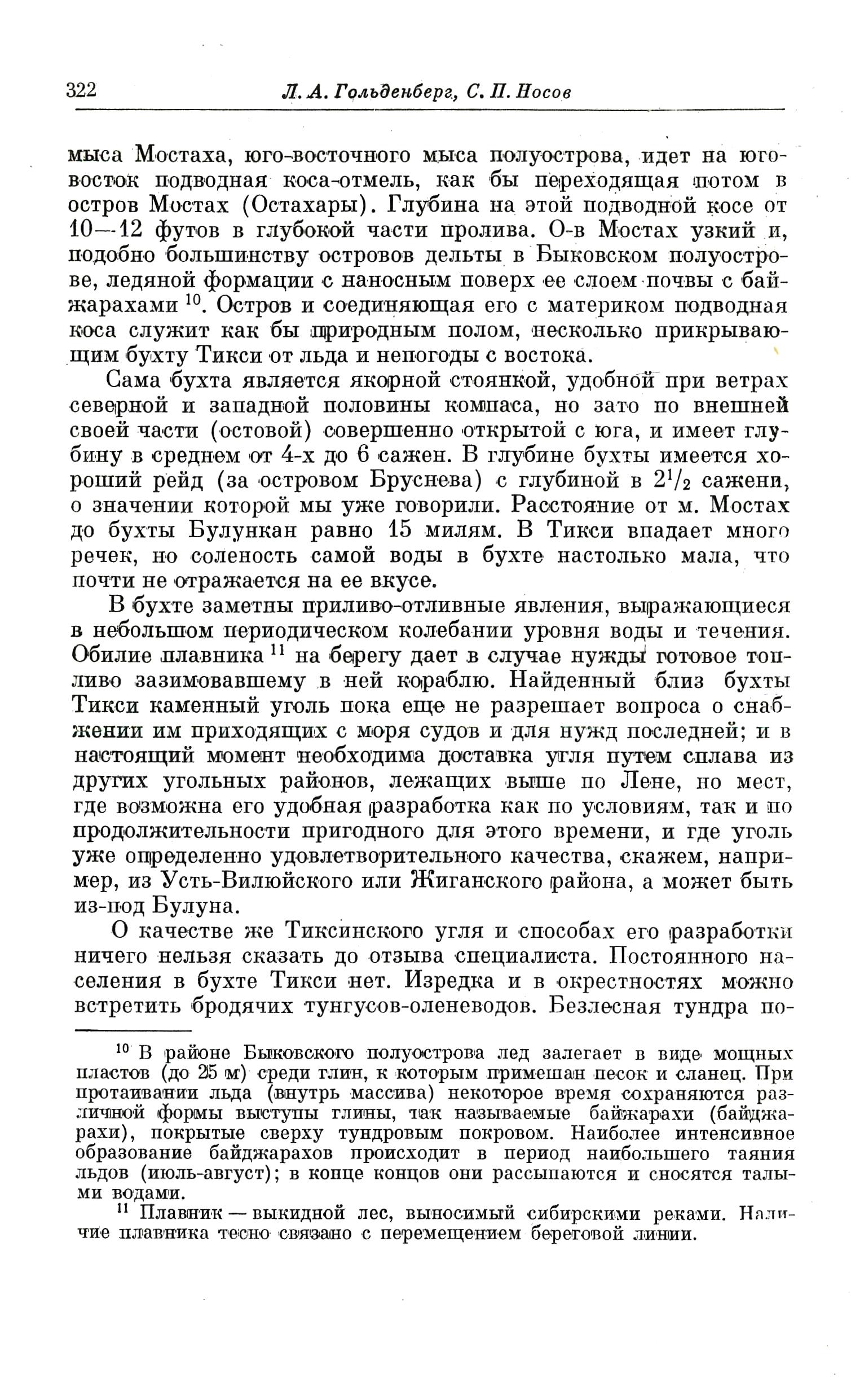 В бухте заметны приливо-отливные явления, выражающиеся в небольшом периодическом колебании уровня воды и течения. Обилие плавника {11} на берегу дает в случае нужды готовое топливо зазимовавшему в ней кораблю. Найденный близ бухты Тикси каменный уголь пока еще не разрешает вопроса о снабжении им приходящих с моря судов и для нужд последней; и в настоящий момент необходима доставка угля путем сплава из других угольных районов, лежащих выше по Лене, но мест, где возможна его удобная разработка как по условиям, так и по продолжительности пригодного для этого времени, и где уголь уже определенно удовлетворительного качества, скажем, например, из Усть-Вилюйского или Жиганского района, а может быть из-под Булуна.