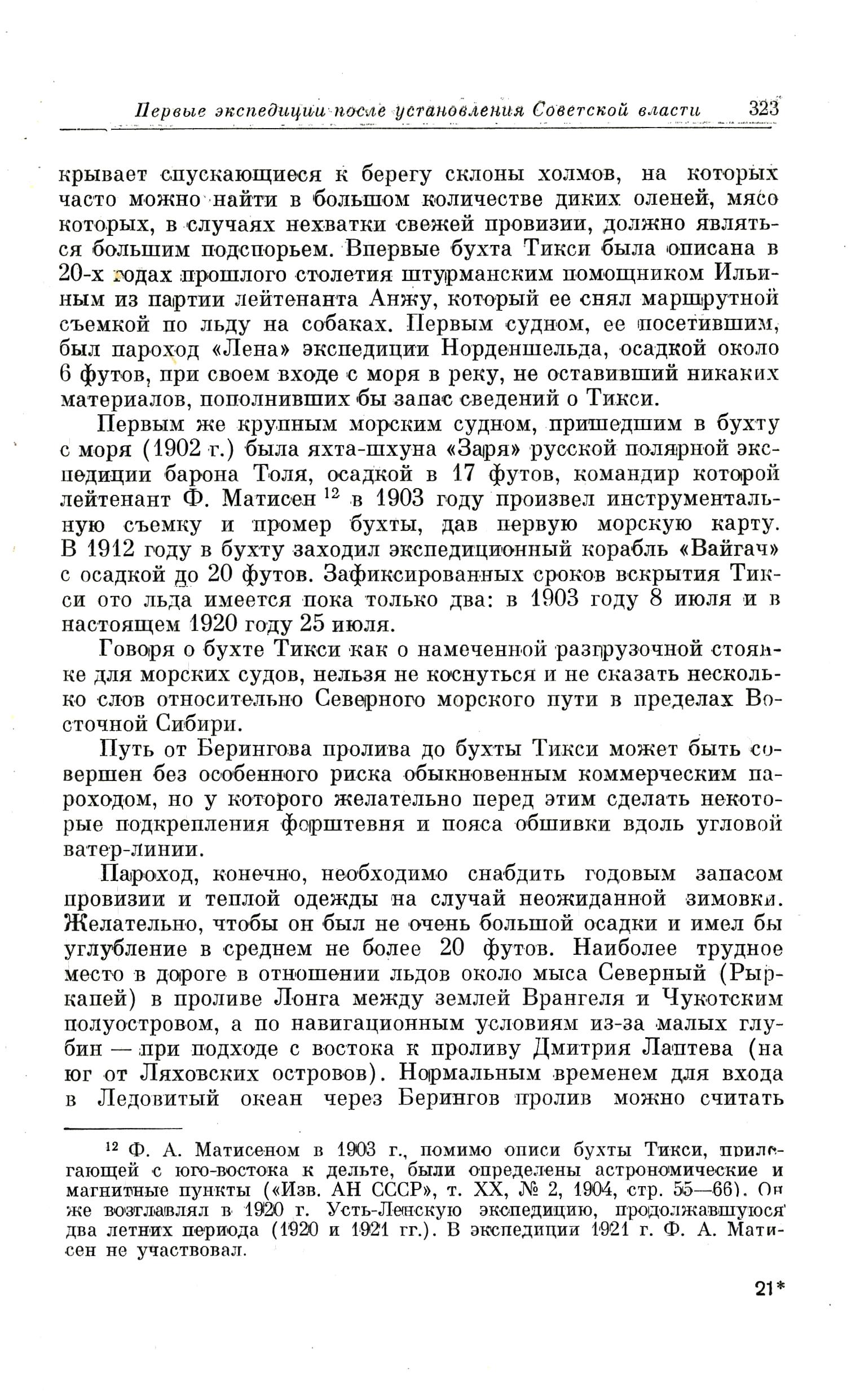 {12} Ф. А. Матисеном в 1903 г., помимо описи бухты Тикси, прилегающей с юго-востока к дельте, были определены астрономические и магнитные пункты («Изв. АН СССР», т. ХХ, № 2, 1904, стр. 55—661. Он же возглавлял в 1920 г. Усть-Ленскую экспедицию, продолжавшуюся два летних периода (1920 и 1921 гг.). В экспедиции 1921 г. Ф. А. Матисен не участвовал.