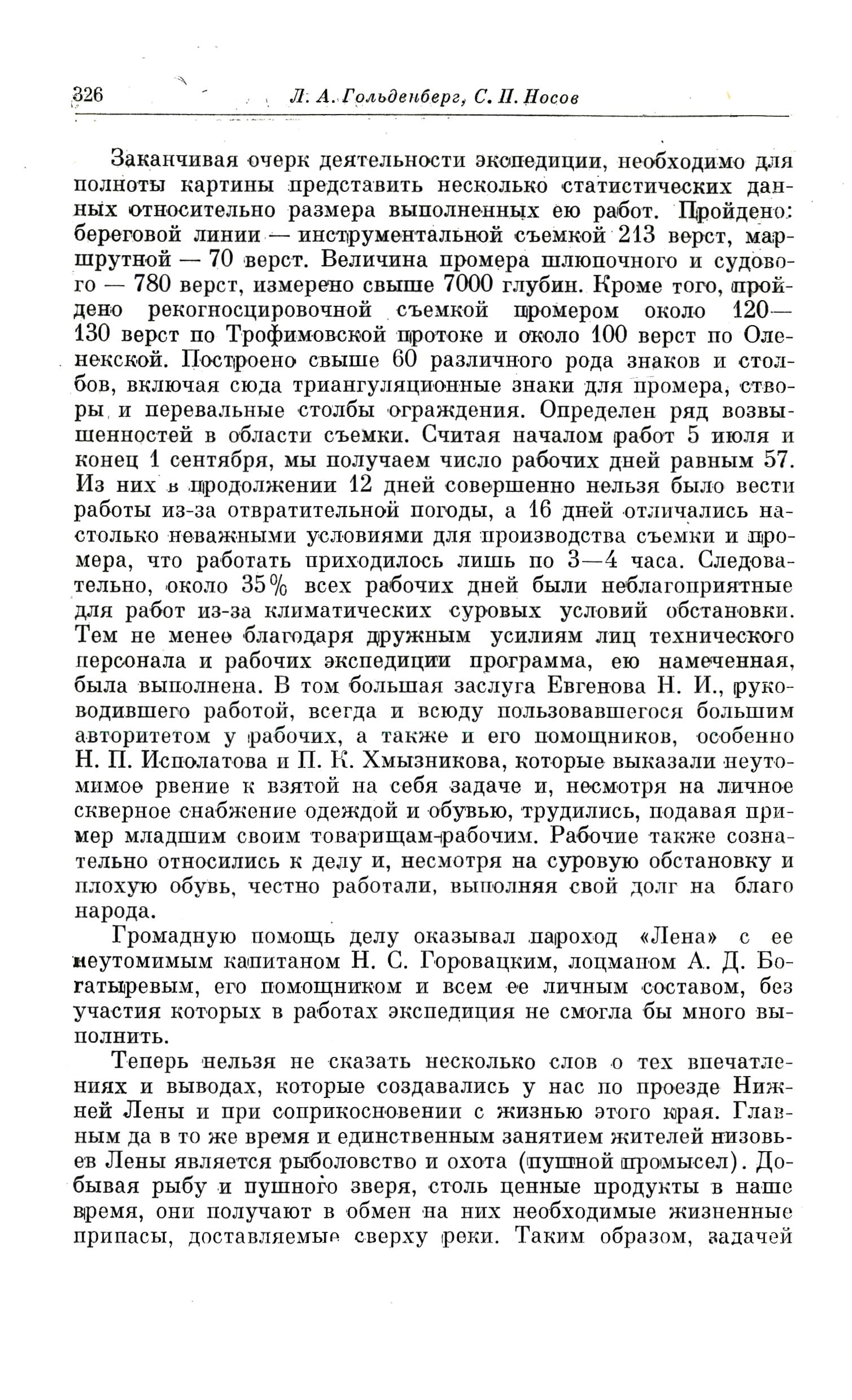 Заканчивая очерк деятельности экспедиции, необходимо для полноты картины представить несколько статистических данных относительно размера выполненных ею работ. Пройдено: береговой линии — инструментальной съемкой 213 верст, маршрутной — 70 верст. Величина промера шлюпочного и судового — 780 верст, измерено свыше 7000 глубин. Кроме того, пройдено рекогносцировочной съемкой промером около 120— 130 верст по Трофимовской протоке и около 100 верст по Оленекской. Построено свыше 60 различного рода знаков и столбов, включая сюда триангуляционные знаки для промера, створы и перевальные столбы ограждения. Определен ряд возвышенностей в области съемки. Считая началом работ 5 июля и конец 1 сентября, мы получаем число рабочих дней равным 57. Из них в продолжении 12 дней совершенно нельзя было вести работы из-за отвратительной погоды, а 16 дней отличались настолько неважными условиями для производства съемки и промера, что работать приходилось лишь по 3—4 часа. Следовательно, около 35% всех рабочих дней были неблагоприятные для работ из-за климатических суровых условий обстановки. Тем не менее благодаря дружным усилиям лиц технического персонала и рабочих экспедиции программа, ею намеченная, была выполнена. В том большая заслуга Евгенова Н. И., руководившего работой, всегда и всюду пользовавшегося большим авторитетом у рабочих, а также и его помощников, особенно Н. П. Исполатова и П. К. Хмызникова, которые выказали неутомимое рвение к взятой на себя задаче и, несмотря на личное скверное снабжение одеждой и обувью, трудились, подавая пример младшим своим товарищам-рабочим. Рабочие также сознательно относились к делу и, несмотря на суровую обстановку и плохую обувь, честно работали, выполняя свой долг на благо народа.