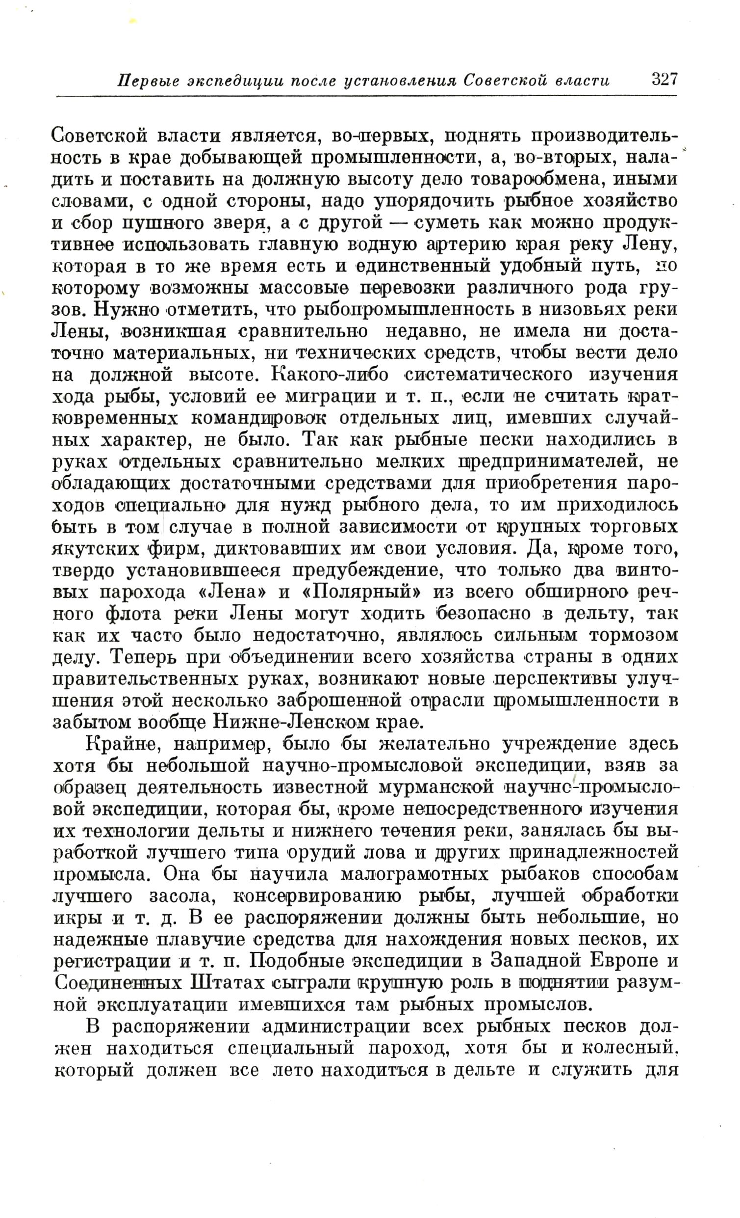 Советской власти является, во-первых, поднять производительность в крае добывающей промышленности, а, во-вторых, наладить и поставить на должную высоту дело товарообмена, иными словами, с одной стороны, надо упорядочить рыбное хозяйство и сбор пушного зверя, а с другой — суметь как можно продуктивнее использовать главную водную артерию края реку Лену, которая в то же время есть и единственный удобный путь, по которому возможны массовые перевозки различного рода грузов. Нужно отметить, что рыбопромышленность в низовьях реки Лены, возникшая сравнительно недавно, не имела ни достаточно материальных, ни технических средств, чтобы вести дело на должной высоте. Какого-либо систематического изучения хода рыбы, условий ее миграции и т. п., если не считать кратковременных командировок отдельных лиц, имевших случайных характер, не было. Так как рыбные пески находились в руках отдельных сравнительно мелких предпринимателей, не обладающих достаточными средствами для приобретения пароходов специально для нужд рыбного дела, то им приходилось быть в том случае в полной зависимости от крупных торговых якутских фирм, диктовавших им свои условия. Да, кроме того, твердо установившееся предубеждение, что только два винтовых парохода «Лена» и «Полярный» из всего обширного речного флота реки Лены могут ходить безопасно в дельту, так как их часто было недостаточно, являлось сильным тормозом делу. Теперь при объединении всего хозяйства страны в одних правительственных руках, возникают новые перспективы улучшения этой несколько заброшенной отрасли промышленности в забытом вообще Нижне-Ленском крае.