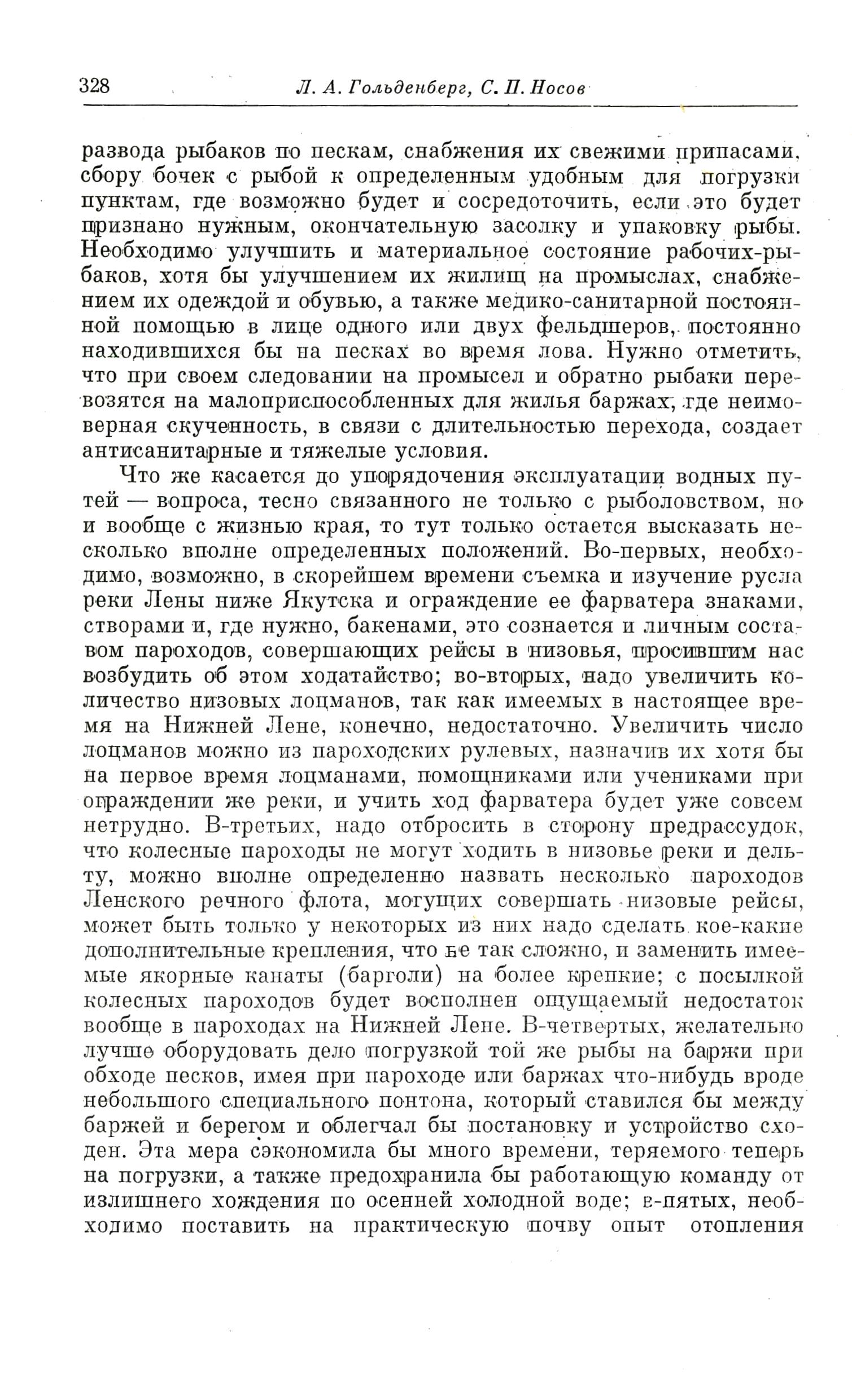 Что же касается до упорядочения эксплуатации водных путей — вопроса, тесно связанного не только с рыболовством, но и вообще с жизнью края, то тут только остается высказать несколько вполне определенных положений. Во-первых, необходимо, возможно, в скорейшем времени съемка и изучение русла реки Лены ниже Якутска и ограждение ее фарватера знаками, створами и, где нужно, бакенами, это сознается и личным составом пароходов, совершающих рейсы в низовья, просившим нас возбудить об этом ходатайство; во-вторых, надо увеличить количество низовых лоцманов, так как имеемых в настоящее время на Нижней Лене, конечно, недостаточно. Увеличить число лоцманов можно из пароходских рулевых, назначив их хотя бы на первое время лоцманами, помощниками или учениками при ограждении же реки, и учить ход фарватера будет уже совсем нетрудно. В-третьих, надо отбросить в сторону предрассудок, что колесные пароходы не могут ходить в низовье реки и дельту, можно вполне определенно назвать несколько пароходов Ленского речного флота, могущих совершать низовые рейсы, может быть только у некоторых из них надо сделать кое-какие дополнительные крепления, что не так сложно, и заменить имеемые якорные канаты (барголи) на более крепкие; с посылкой колесных пароходов будет восполнен ощущаемый недостаток вообще в пароходах на Нижней Лене. В-четвертых, желательно лучше оборудовать дело погрузкой той же рыбы на баржи при обходе песков, имея при пароходе или баржах что-нибудь вроде небольшого специального понтона, который ставился бы между баржей и берегом и облегчал бы постановку и устройство сходен. Эта мера сэкономила бы много времени, теряемого теперь на погрузки, а также предохранила бы работающую команду от излишнего хождения по осенней холодной воде; в-пятых, необходимо поставить на практическую почву опыт отопления