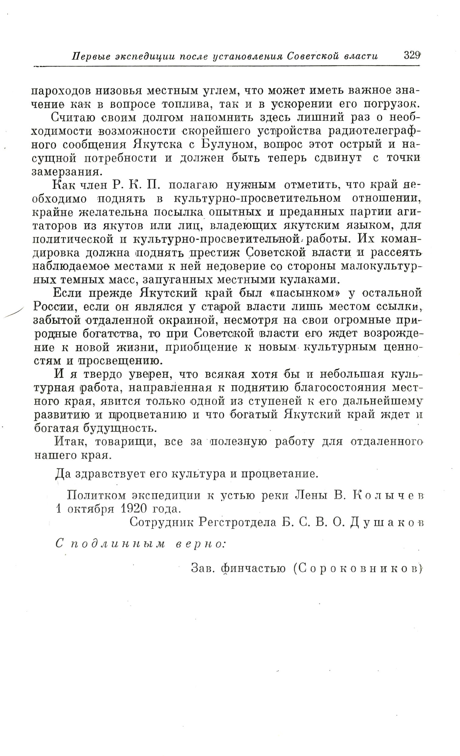 Как член Р. К. П. полагаю нужным отметить, что край необходимо поднять в культурно-просветительном отношении, крайне желательна посылка опытных и преданных партии агитаторов из якутов или лиц, владеющих якутским языком, для политической и культурно-просветительной работы. Их командировка должна поднять престиж Советской власти и рассеять наблюдаемое местами к ней недоверие со стороны малокультурных темных масс, запуганных местными кулаками.