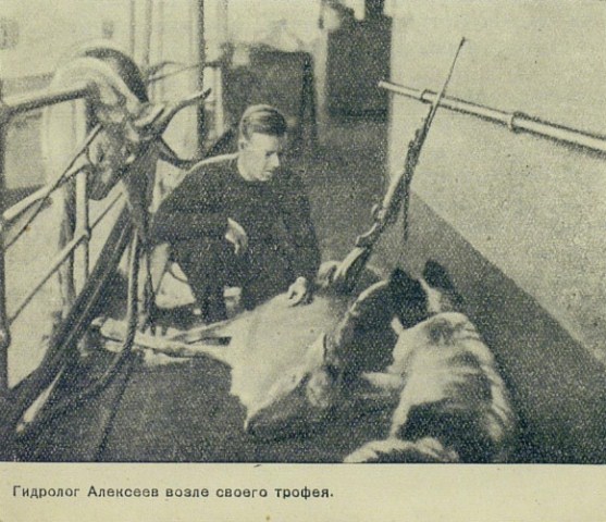 Алексеев с первой пули уложил на-днях белого медведя, попав ему в самый череп. Пушистая шуба медведя висела на релинге ледокола.