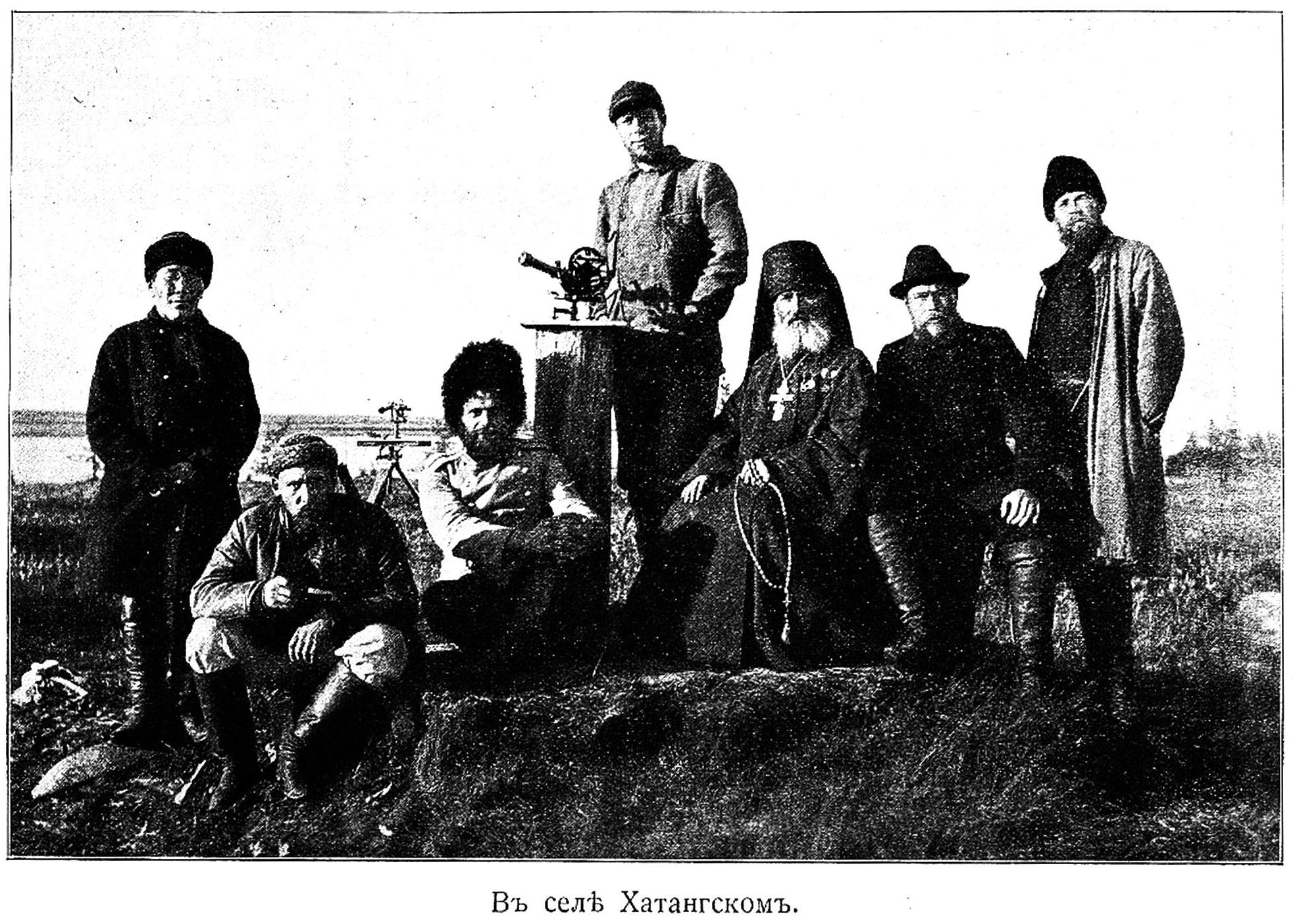 В центре с кипрегелем Кожевников М. Я.<br /><br />Фото из издания:Записки Военно-топографического отдела Главного управления Генерального штаба. Ч. 64. Отд-ние 1. - СПб., 1910.<br />Маршрутная съемка бассейна реки Хатанги в 1905 году. Корпуса Военных Топографов капитана Кожевникова.<br />с.77-100+карта. : В селе Хатангском.jpg