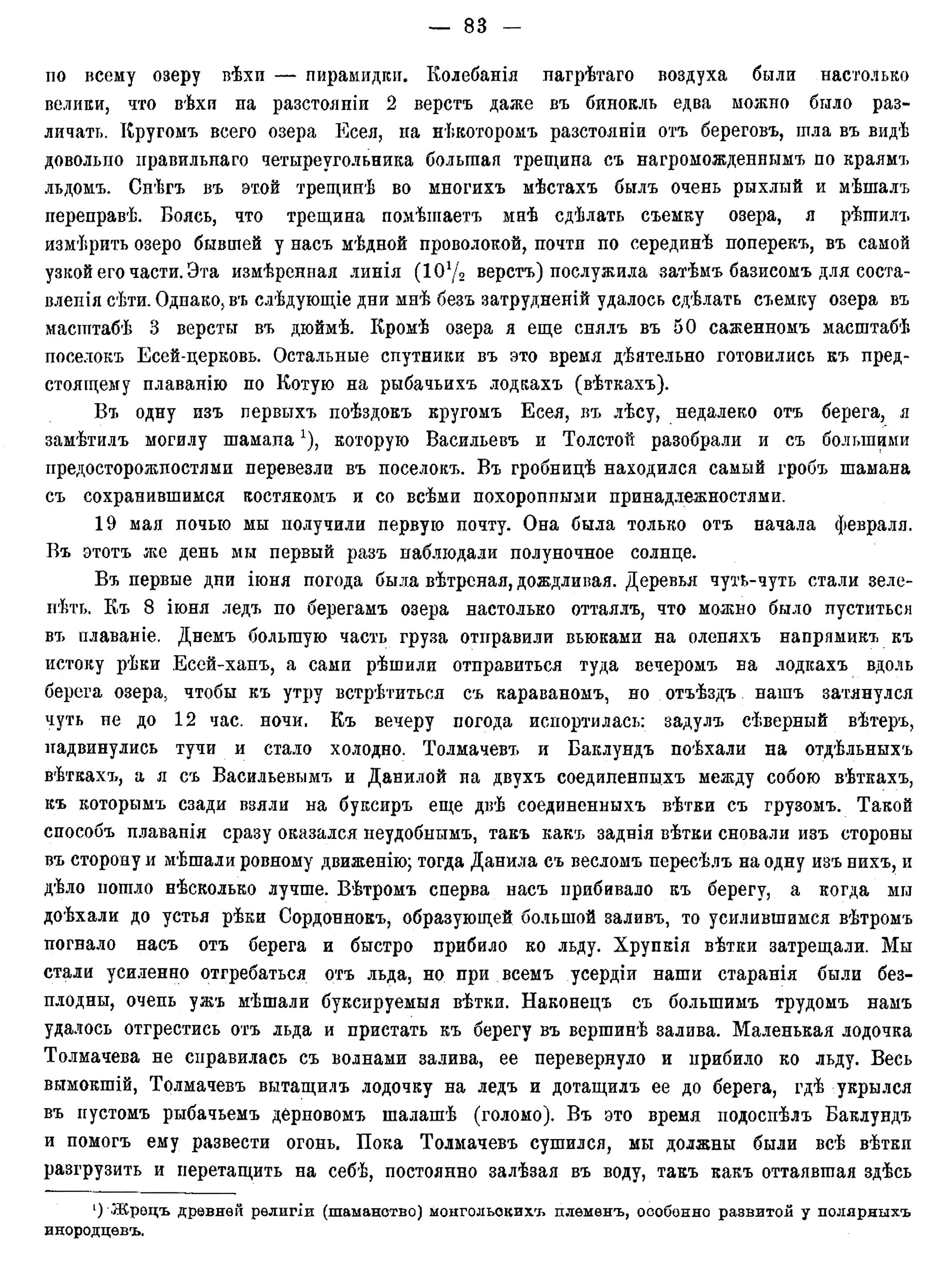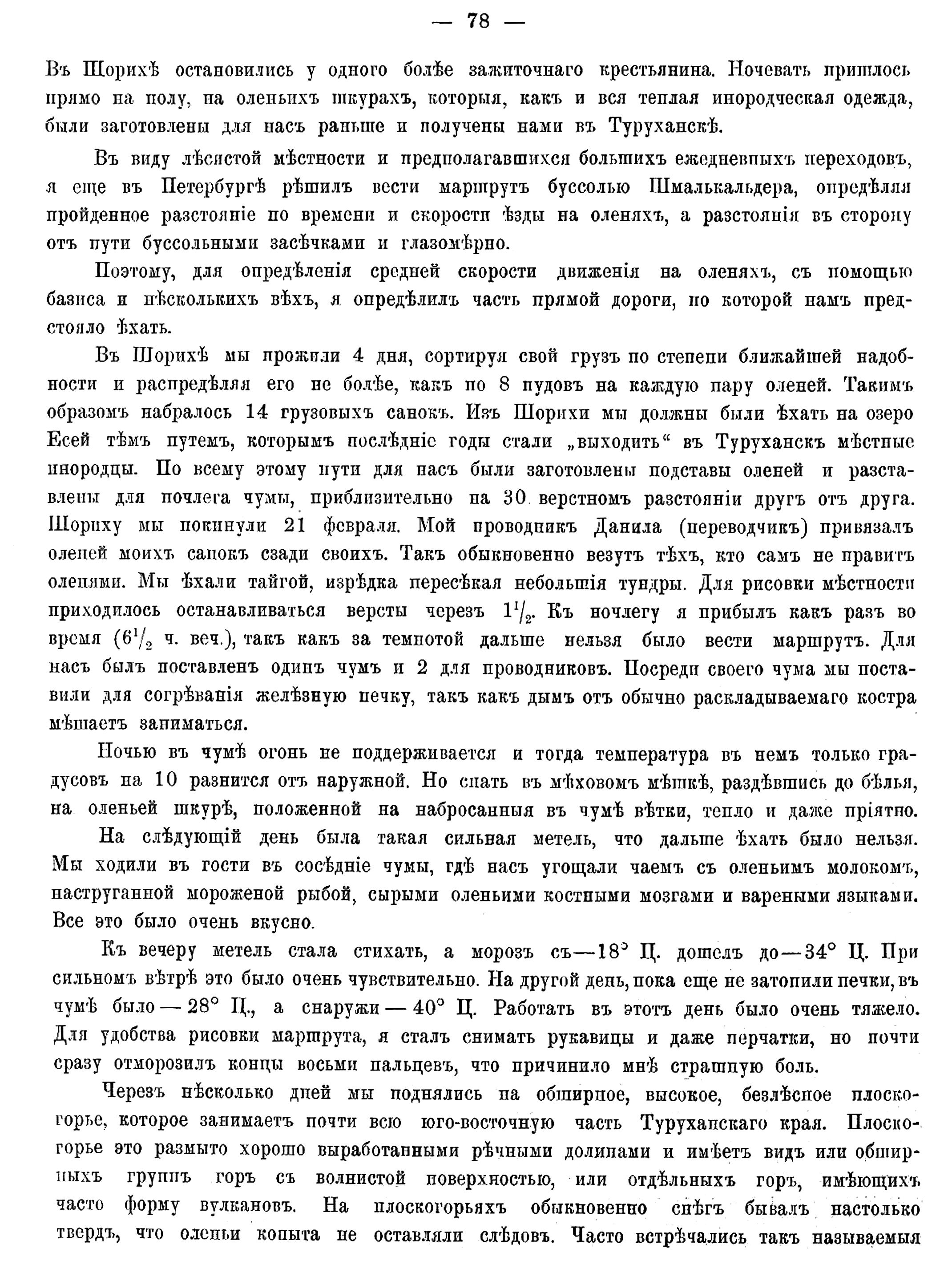 Во время моего пребыванія на мурманской съемкѣ я никогда не отдѣлялся отъ общаго лагеря партіи, хотя это было бы полезно для болѣе успѣшнаго хода топографическихъ работъ. Главной причиной этому была настолько непостоянная здѣшняя погода, что никогда не знаешь, что будетъ черезъ нѣсколько часовъ. Часто случалось, что дожди, туманъ или сильные вѣтры не позволяли по нѣсколько дней приступить къ работѣ, а одно лѣто мы 3 недѣли почти безвыходно просидѣли въ палаткахъ. Конечно, при такихъ условіяхъ лучше сидѣть въ хорошо оборудованномъ лагерѣ, чѣмъ, отдѣлившись отъ него налегкѣ, ютиться въ походной палаткѣ. О силѣ вѣтра можно уже судить потому, что я находилъ на высотѣ около двадцати сажень заплески соленой воды. Послѣ нѣсколькихъ дней сильнаго вѣтра на водѣ всегда бывала большая зыбь, мѣшавшая высадиться на берегъ.