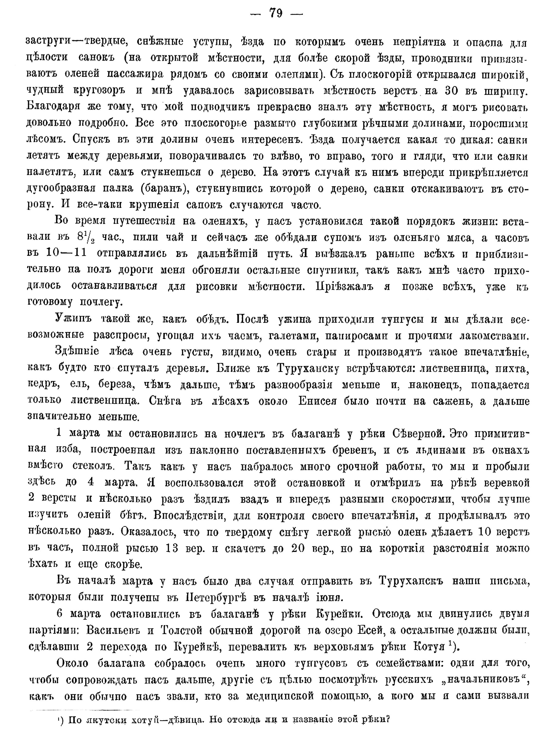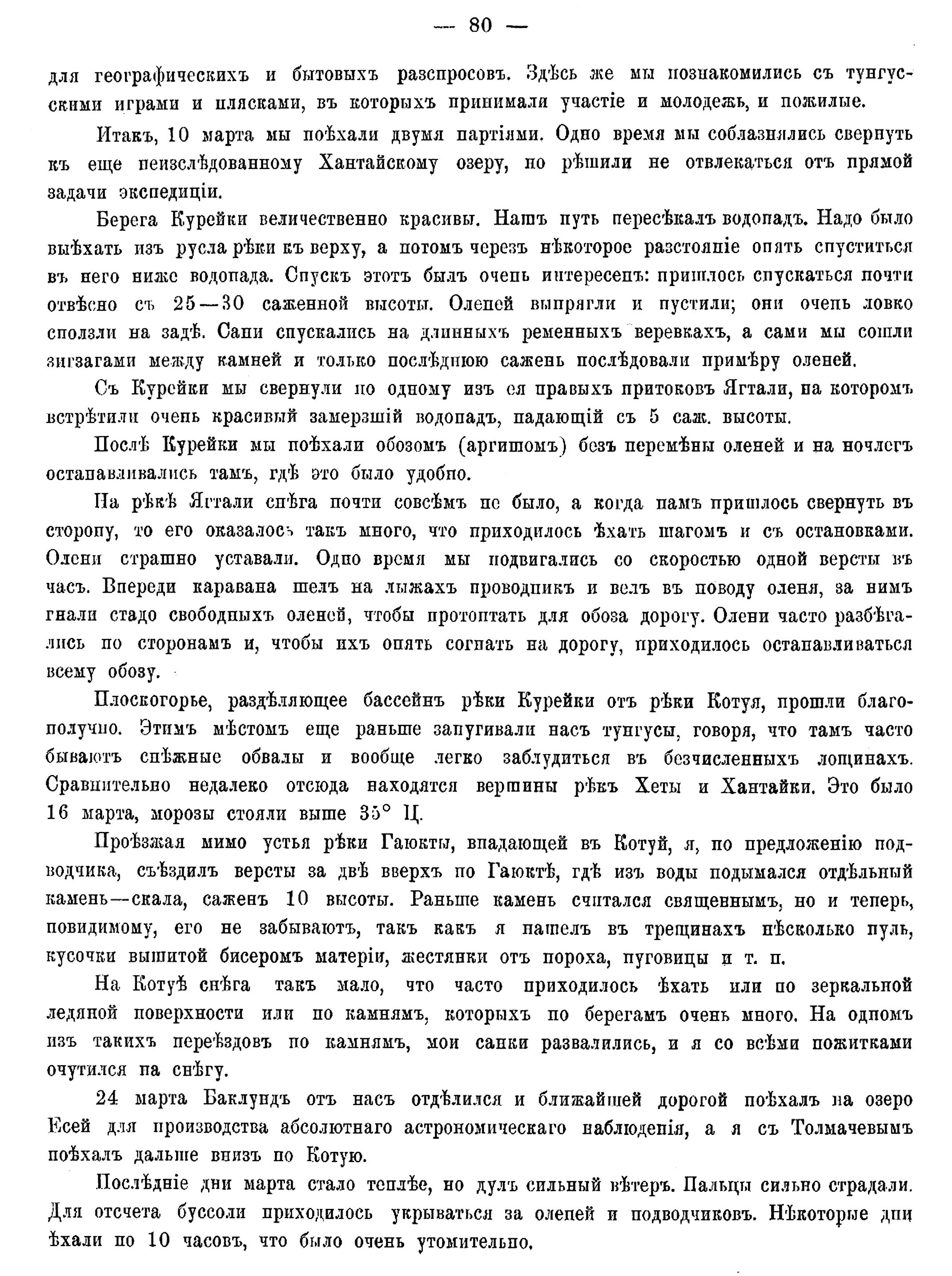 Обиліе нерабочаго времени позволяло намъ также почти регулярно черезъ двѣ недѣли устранвать баню. Для этого у ближайшаго къ лагерю ручья складывали изъ камней печку, дѣлали 2 лавки и полъ съ такимъ расчетомъ, чтобы надъ всѣмъ этимъ можно было поставить палатку. Когда печка достаточно накалена, офицеры и рабочіе мылись всегда съ большимъ удовольствіемъ.