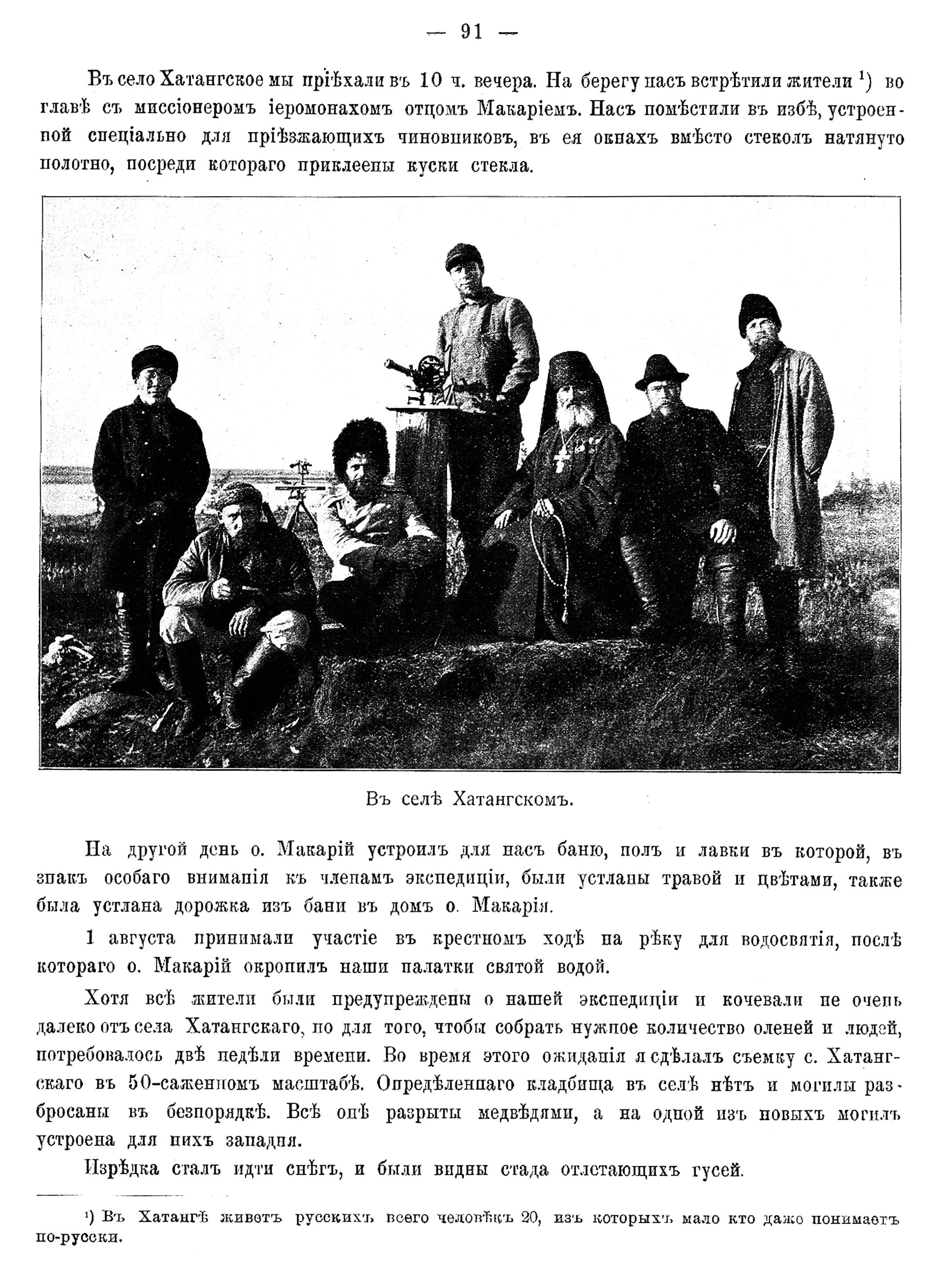 На окончательные сборы въ Архангельскѣ уходило нѣсколько дней. Въ эти дни съемочными партіями закупался запасъ такой провизіи, которую здѣсь пріобрѣсти выгоднѣе, чѣмъ въ Александровскѣ; папримѣръ: муку, крупу, лукъ, капусту и на первое время хлѣбъ и мясо; чай-же, сахаръ и рисъ закупали въ Александровскѣ, какъ продающіеся тамъ безъ пошлины.