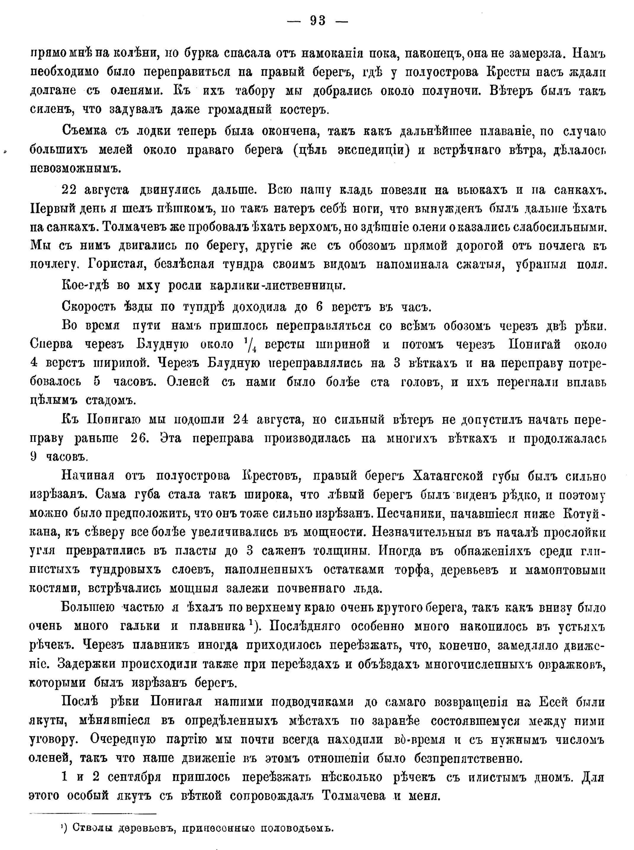 довольно рѣдко: или вѣтеръ былъ неподходящій, или его совсѣмъ не было. Чаще приходилось плыть противъ волнъ или противъ приливного теченія. Одинъ разъ поднялся такой сильный вѣтеръ, что гребцы не могли справиться съ волнами. Пришлось пристать къ берегу, вытащить карбасъ и возвратиться въ лагерь пѣшкомъ.