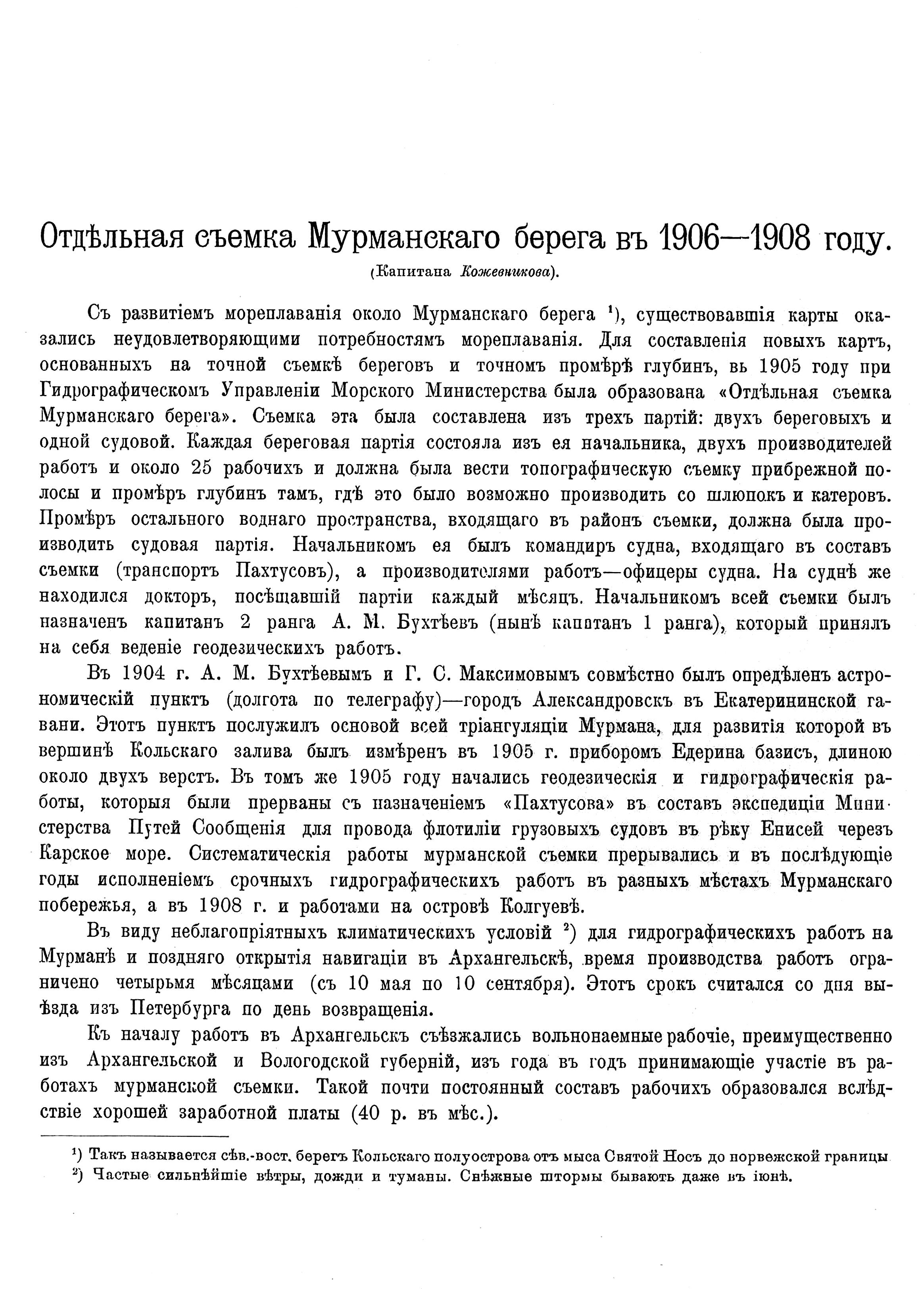 Съ развитіемъ мореплаванія около Мурманскаго берега 1), существовавшія карты оказались неудовлетворяющими потребностямъ мореплаванія. Для составленія новыхъ картъ, основанныхъ на точной съемкѣ береговъ и точномъ промѣрѣ глубинъ, вь 1905 году при Гидрографическомъ Управленіи Морского Министерства была образована «Отдѣльная съемка Мурманскаго берега». Съемка эта была составлена изъ трехъ партій: двухъ береговыхъ и одной судовой. Каждая береговая партія состояла изъ ея начальника, двухъ производителей работъ и около 25 рабочихъ и должна была вести топографическую съемку прибрежной полосы и промѣръ глубинъ тамъ, гдѣ это было возможно производить со шлюпокъ и катеровъ. Промѣръ остального воднаго пространства, входящаго въ районъ съемки, должна была производить судовая партія. Начальникомъ ея былъ командиръ судна, входящаго въ составъ съемки (транспортъ Пахтусовъ), а производитслями работъ—офицеры судна. На суднѣ же находился докторъ, посѣщавшій партіи каждый мѣсяцъ. Начальникомъ всей съемки былъ назначенъ капитанъ 2 ранга А. М. Бухтѣевъ (нынѣ капитанъ 1 ранга), который принялъ на себя веденіе геодезическихъ работъ.