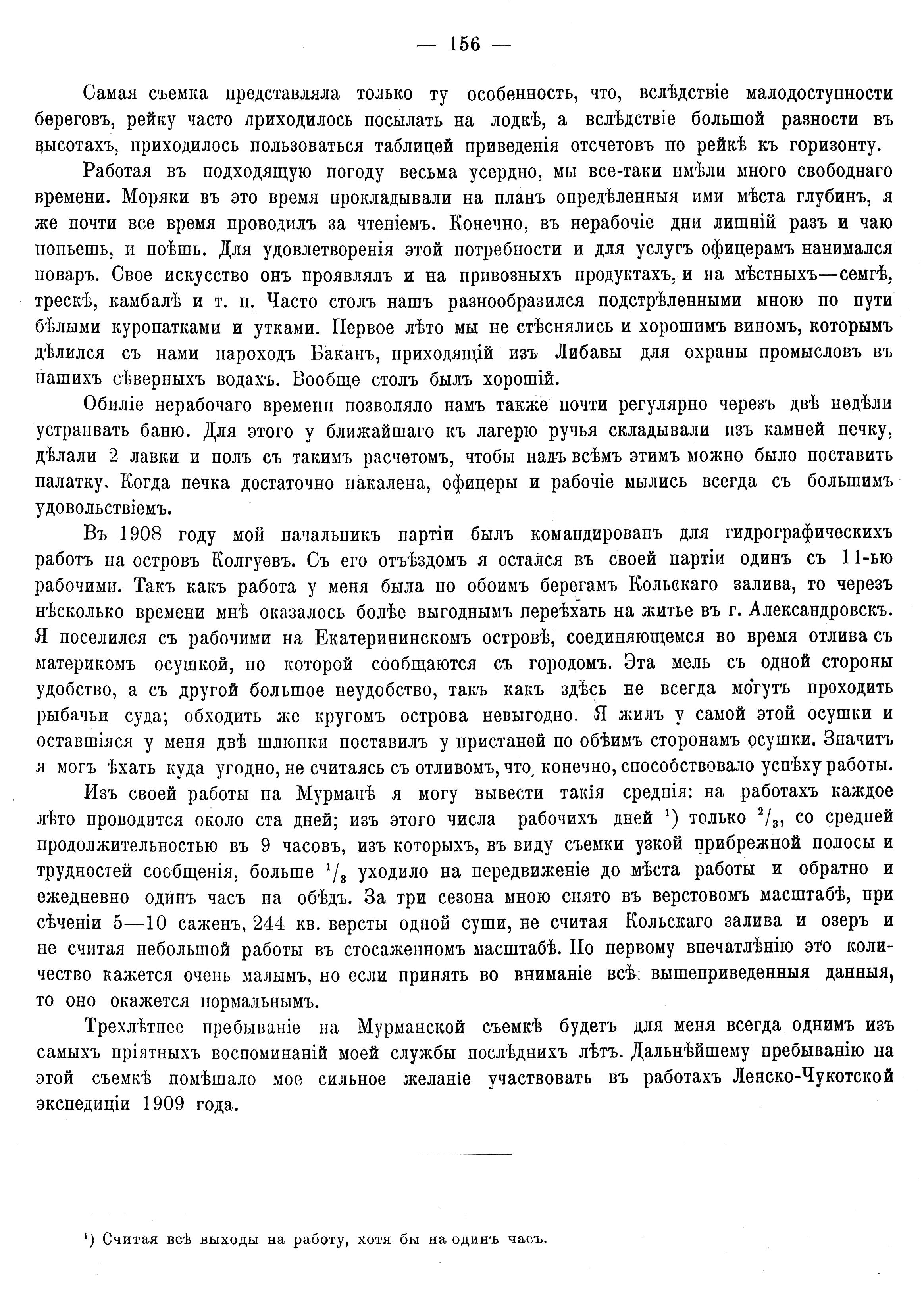 Изъ своей работы на Мурманѣ я могу вывести такія среднія: на работахъ каждое лѣто проводится около ста дней; изъ этого числа рабочихъ дней 1) только 2/3, со средней продолжительностью въ 9 часовъ, изъ которыхъ, въ виду съемки узкой прибрежной полосы и трудностей сообщенія, больше 1/3 уходило на передвиженіе до мѣста работы и обратно и ежедневно одинъ часъ на обѣдъ. За три сезона мною снято въ верстовомъ масштабѣ, при сѣченіи 5—10 саженъ, 244 кв. версты одной суши, не считая Кольскаго залива и озеръ и не считая небольшой работы въ стосаженномъ масштабѣ. По первому впечатлѣнію это количество кажется очень малымъ, но если принять во вниманіе всѣ вышеприведенныя данныя, то оно окажется нормальнымъ.