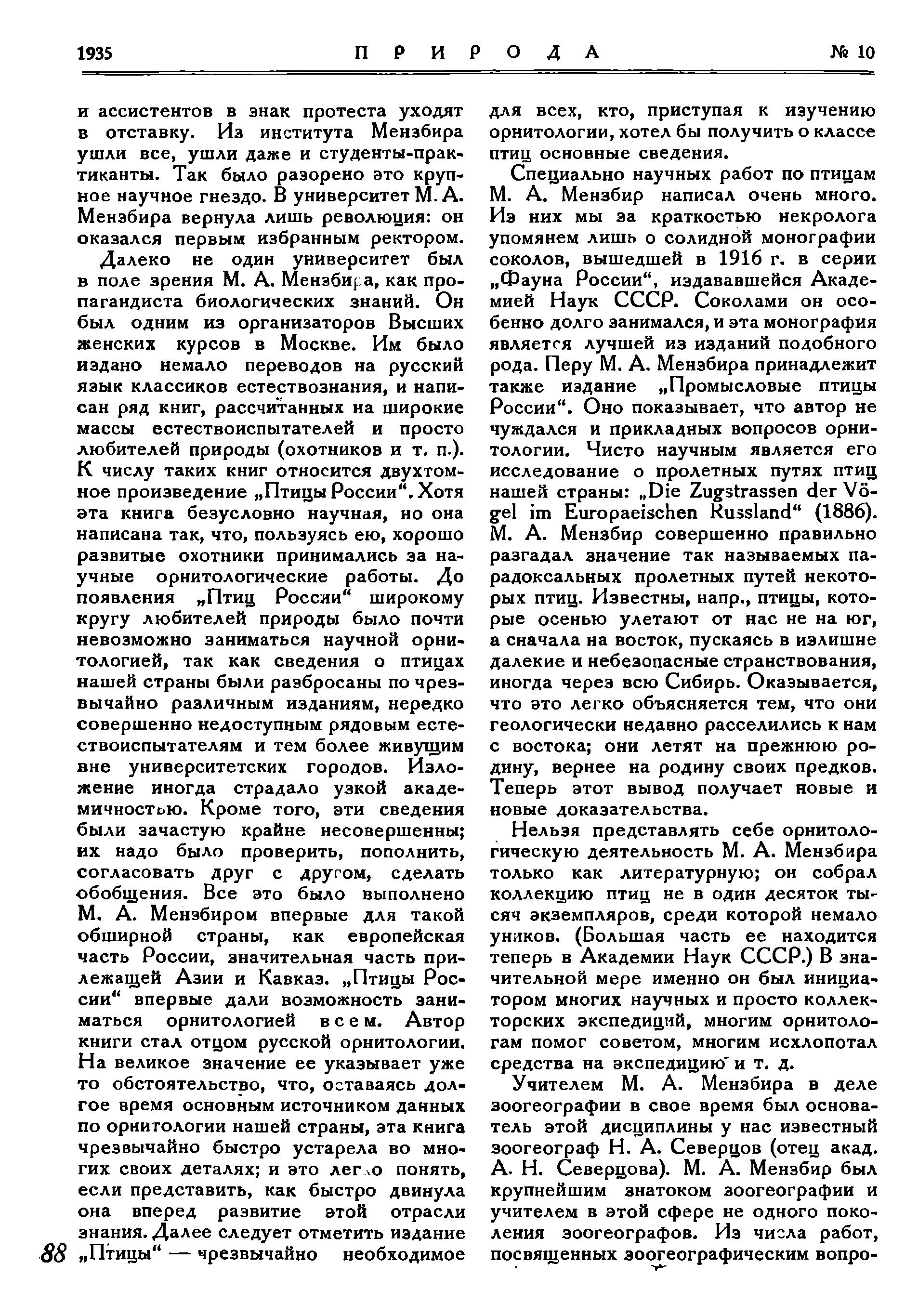 Одним из важных событий отечественной зоологии стало издание фундаментальной сводки «Птицы России» (1893-1895). В ней впервые осуществлен синтез знаний по систематике, распространению и экологии птиц, впоследствии развитый в трудах П. П. Сушкина, С. И. Огнева, С. А. Бутурлина, Н. А. Бобринского, Г. П. Дементьева, их многочисленных соратников и учеников. Для орнитологов страны сводка «Птицы России» на многие годы стала образцом фундаментально выполненного исследования.