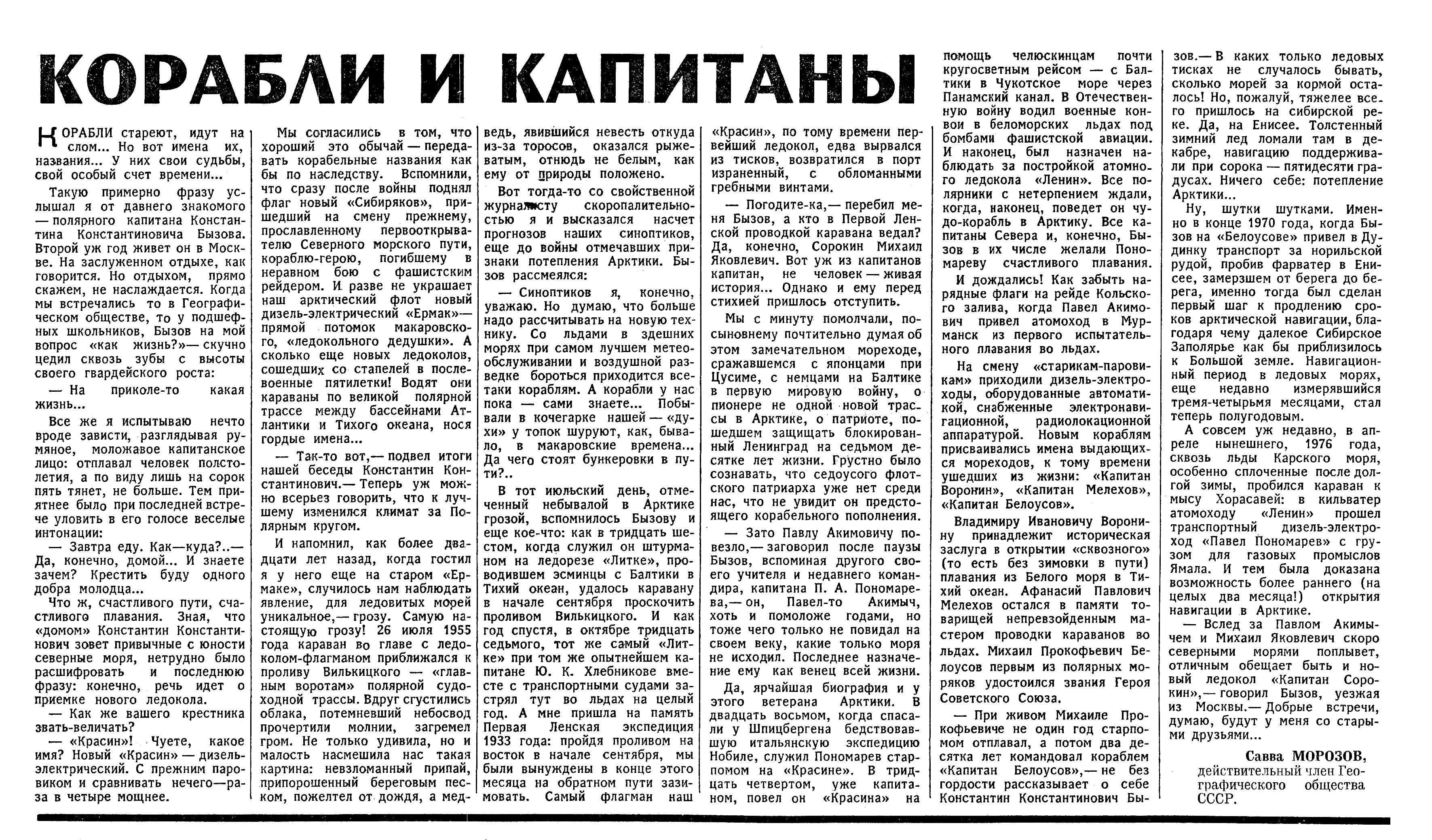 — При живом Михаиле Прокофьевиче не один год старпомом отплавал, а потом два десятка лет командовал кораблем «Капитан Белоусов», — не без гордости рассказывает о себе Константин Константинович Бызов. — В каких только ледовых тисках не случалось бывать, сколько морей за кормой осталось! Но, пожалуй, тяжелее всего пришлось на сибирской реке. Да, на Енисее. Толстенный зимний лед ломали там в декабре, навигацию поддерживали при сорока — пятидесяти градусах. Ничего себе: потепление Арктики...