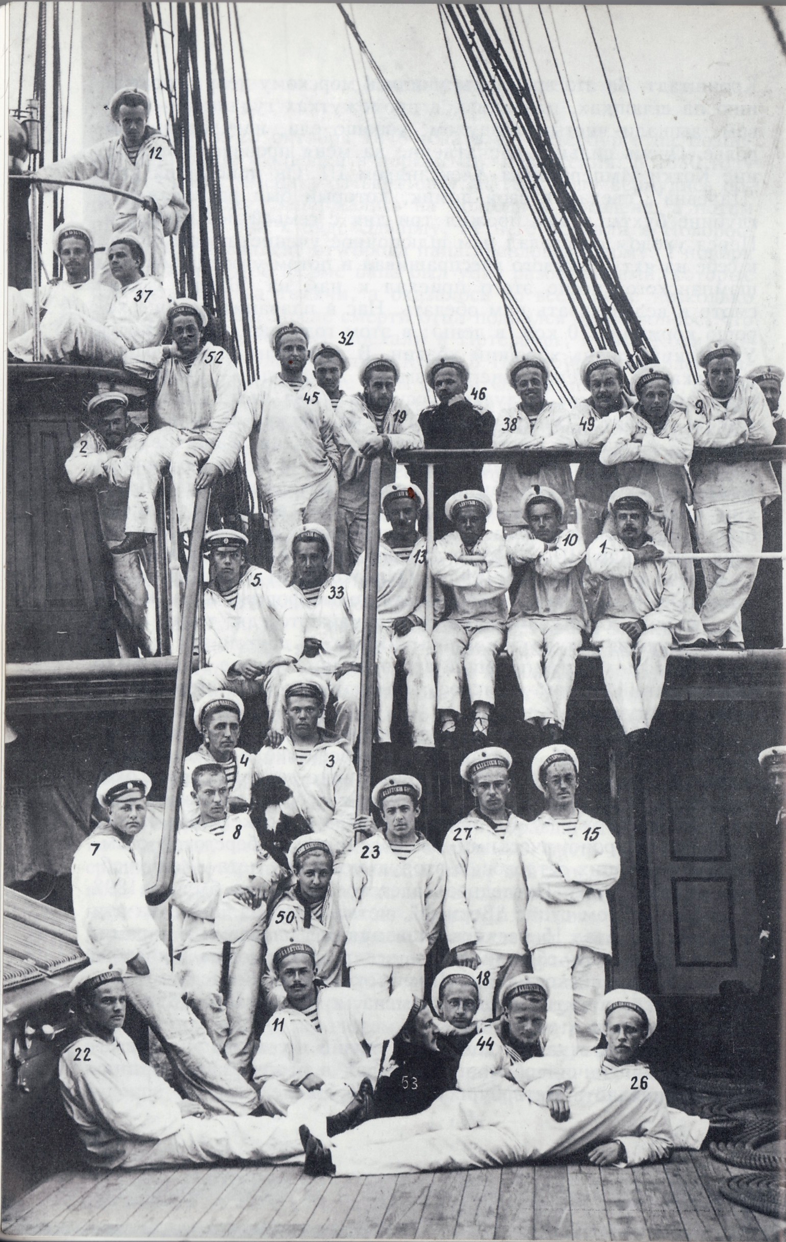 Пошла работа. Кидали все за борт. Вдруг дымки! Начались споры “свои это или японцы”. Большинство успокаивало себя, что это наши крейсера, но я сразу почуял, что это они. Через несколько минут вырисовались силуэты пяти крейсеров. Адмирал поднял сигнал “Приготовиться к бою” и повернул на них, но те отвернули. Легли на старый курс. Слева все время стали присоединяться отдельные корабли, и скоро их шло параллельно нам 11 штук. Через некоторое время за линией неприятельских судов появилась стройная линия в 12 дымков. Они стали быстро приближаться к нам, и скоро вырисовались силуэты... Шведе позвал меня и приказал похоронить до боя убитых. Батюшка не хотел идти на ют, говоря, что сейчас начнут стрелять и его убьют. Я официально приказал ему идти со мной. Прочитали краткую молитву и выбросили за борт 28 трупов. Первыми бросили бедного Андрюшу Шупинского (лейтенант А. П. Шупинский, убит в бою. —