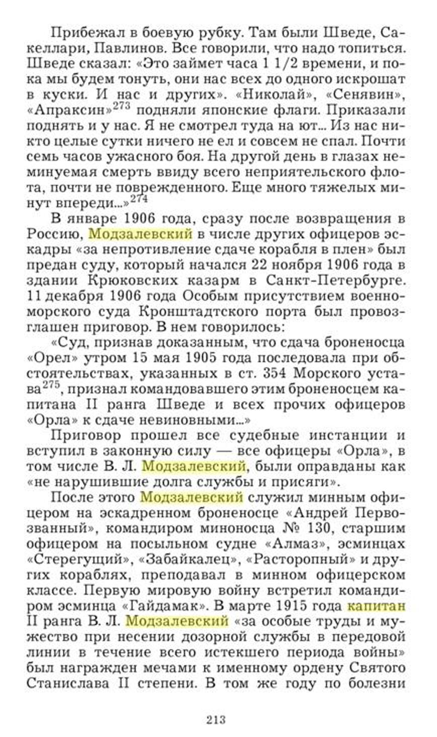 В дневнике, который велся в японском плену в Осаке, остались строки, написанные рукой лейтенанта Модзалевского 11 августа 1905 года: «... Сиденье в плену ужасно развращает человека, — привыкаешь ничего не делать, излыниваешь до невозможности. И это после 8 месяцев непрерывного тяжелого труда в плавании. Сколько бессонных ночей, сколько тревог, сколько работы, наконец 6 1/2 часов адского боя, — все прошло даром, бесследно, навеки потонув в водах Цусимского пролива. А что еще предстоит впереди? Может быть, суд, исключение со службы, презрение всех за сдачу корабля. Бедный “Орел”! С самой закладки не везло ему. Горел на стапеле, стоял на мели в Неве, тонул, опять стоял на мели, все плавание не везло, сборная отвратительная команда. Помню слова Рожественского на второй день Пасхи после бунта: “Единственный способ смыть ваш позор, это всем погибнуть в бою и утопить этот корабль! Первоклассный броненосец и такая мерзость! ” Но его слова не сбылись. “Орел” дрался в бою, как орел, два раза закрывал собой поврежденный “Суворов” (эскадренный броненосец “Князь Суворов” — флагманский корабль, на котором находился командующий эскадрой. —