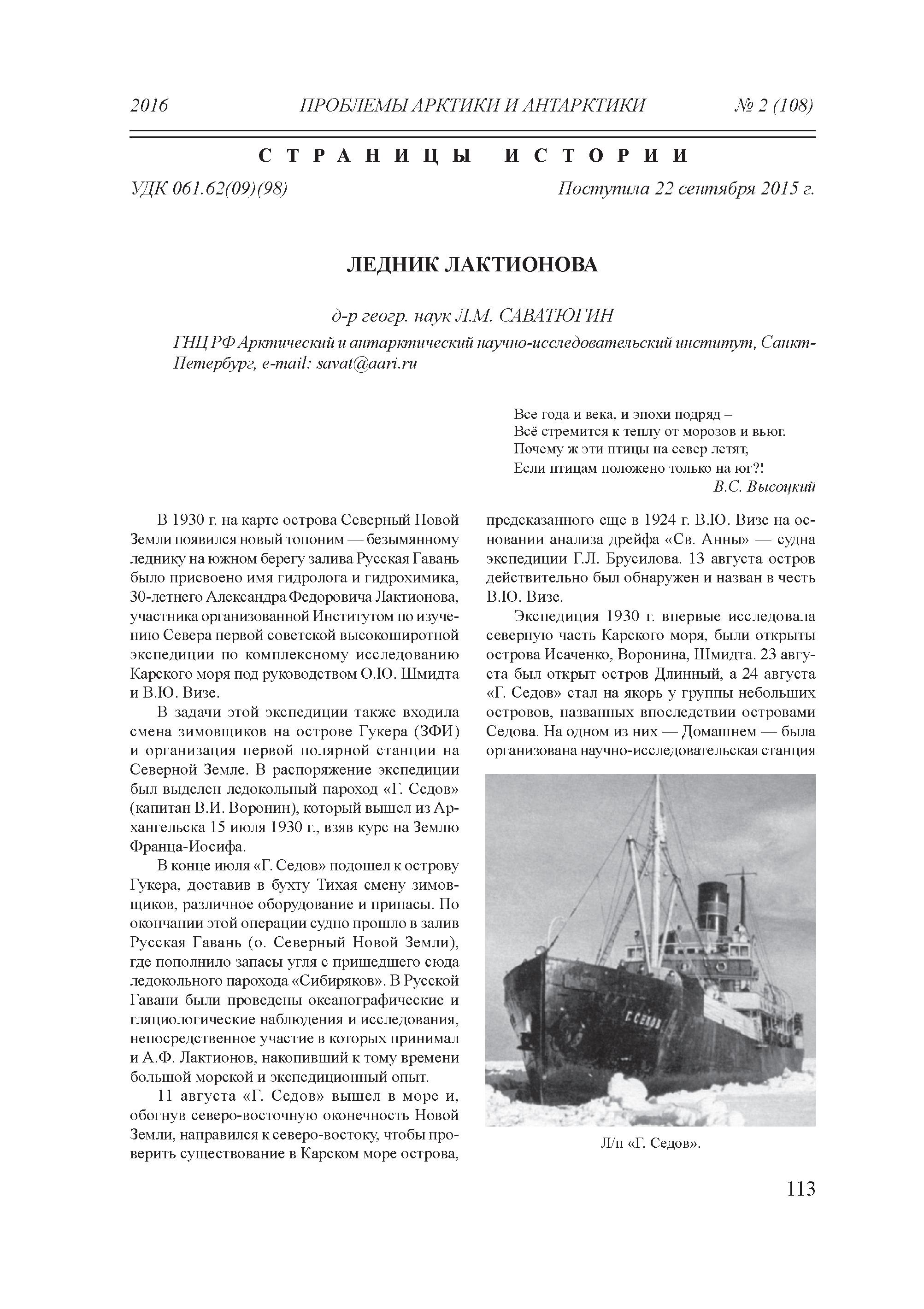 В статье д-ра геогр. наук Л.М. САВАТЮГИНА, "Ледник Лактионова",