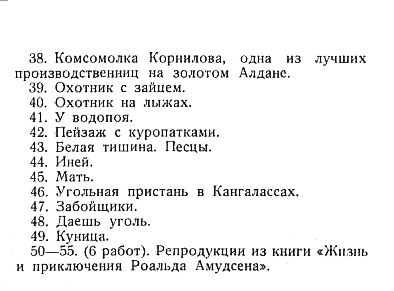 Гражданская война, скотоводство, земледелие, золотодобыча, соледобыча, каменноугольные копи, транспорт, колхозы, совхозы, охота, рыбная ловля, школа, больница, красные партизаны, разгромившие белую армию, ударники и ударницы колхозов и совхозов, пионеры, комсомольцы, совпартшколовцы, студенты, новая женщина, и, наконец, пейзаж и быт — вот моя якутская тематика.