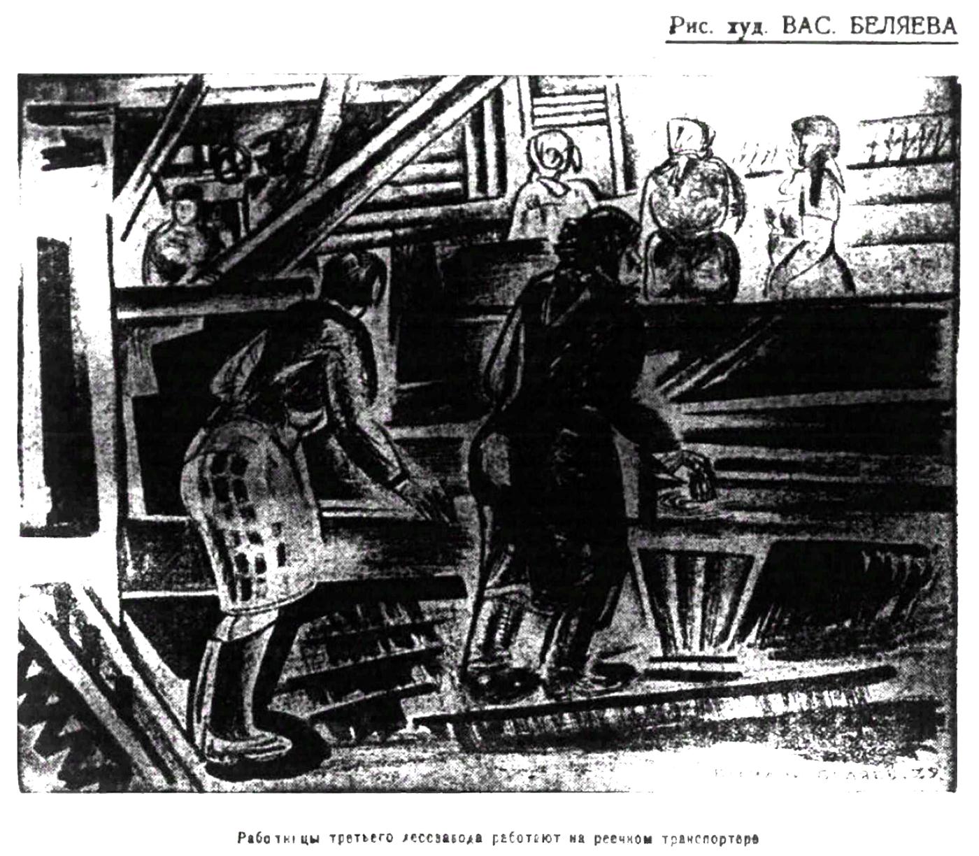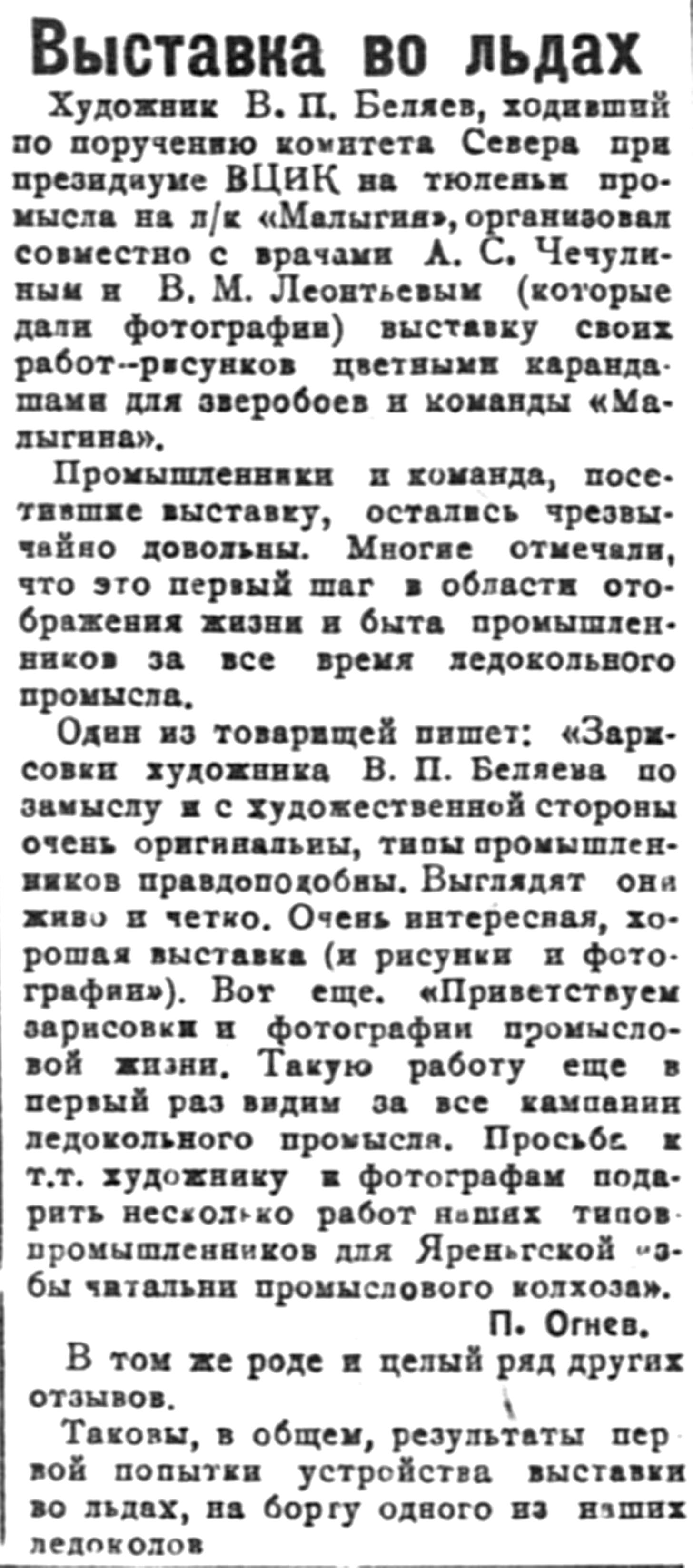 Одни из товарищей пишет: «Зарисовки художника В. П. Беляева по замыслу и с художественной стороны очень оригинальны, типы промышленников правдоподобны. Выглядят они живо и четко. Очень интересная, хорошая выставка (и рисунки и фотографии»). Вот еще. «Приветствуем зарисовки и фотографии промысловой жизни. Такую работу еще в первый раз видим за все кампании ледокольного промысла. Просьба, к т. т. художнику и фотографам подарить несколько работ наших типов промышленников для Яреньгской избы-читальни промыслового колхоза».
