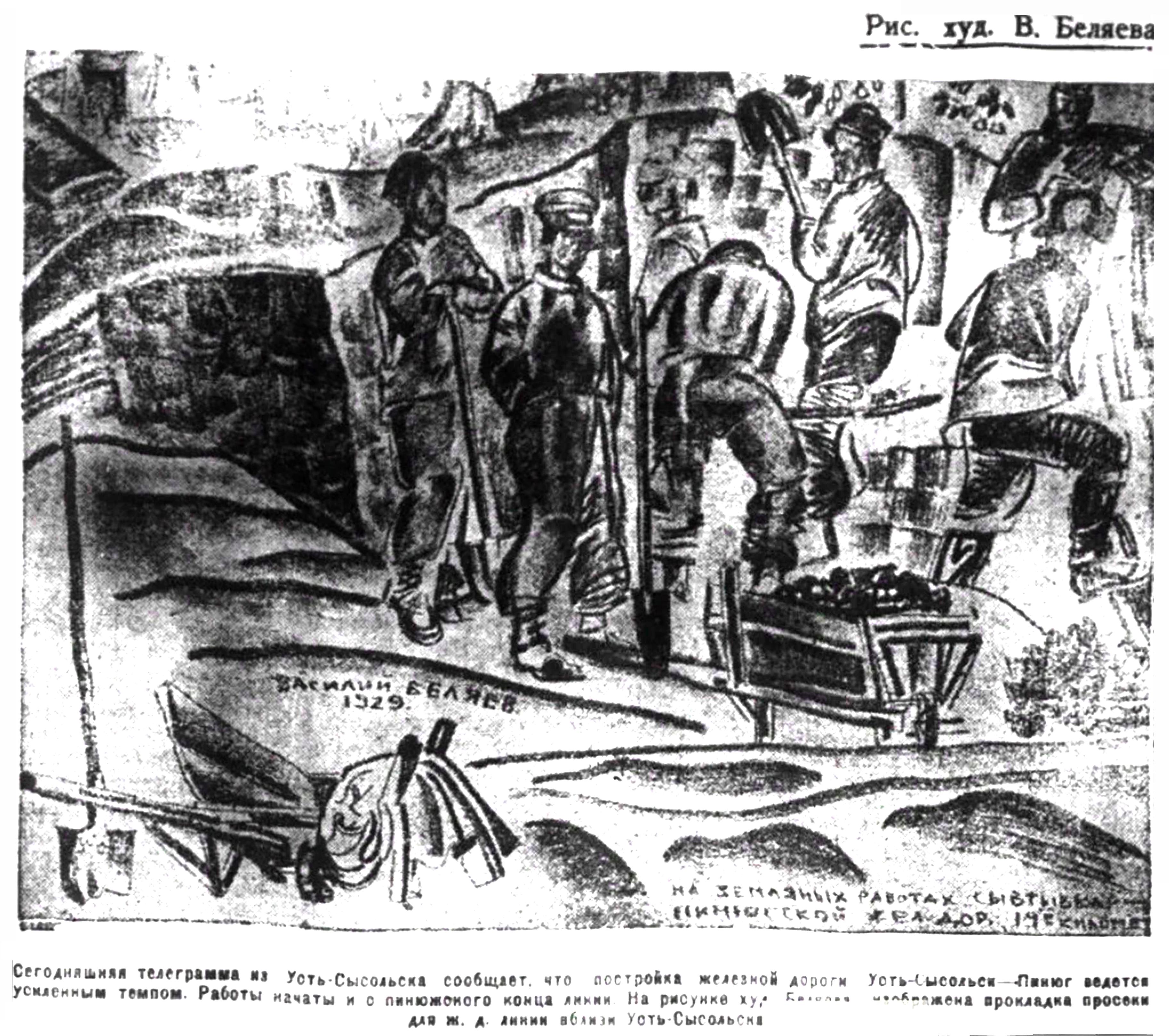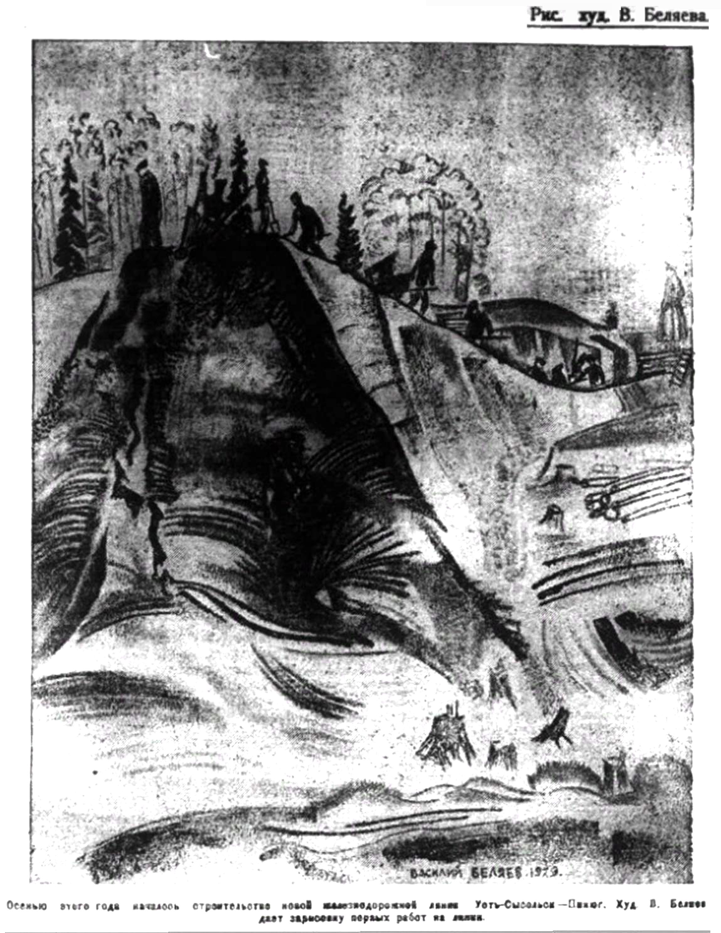 Сегодняшняя телеграмма из Усть-Сысольска сообщает, что построка железной дороги Усть-Сысольск - Пинюг ведется усиленным темпом. Работы начаты и с пинюжского конца линии. На рисунке худ. Беляева изображена прокладка просеки для ж. д. линии вблизи Усть-Сысольска.