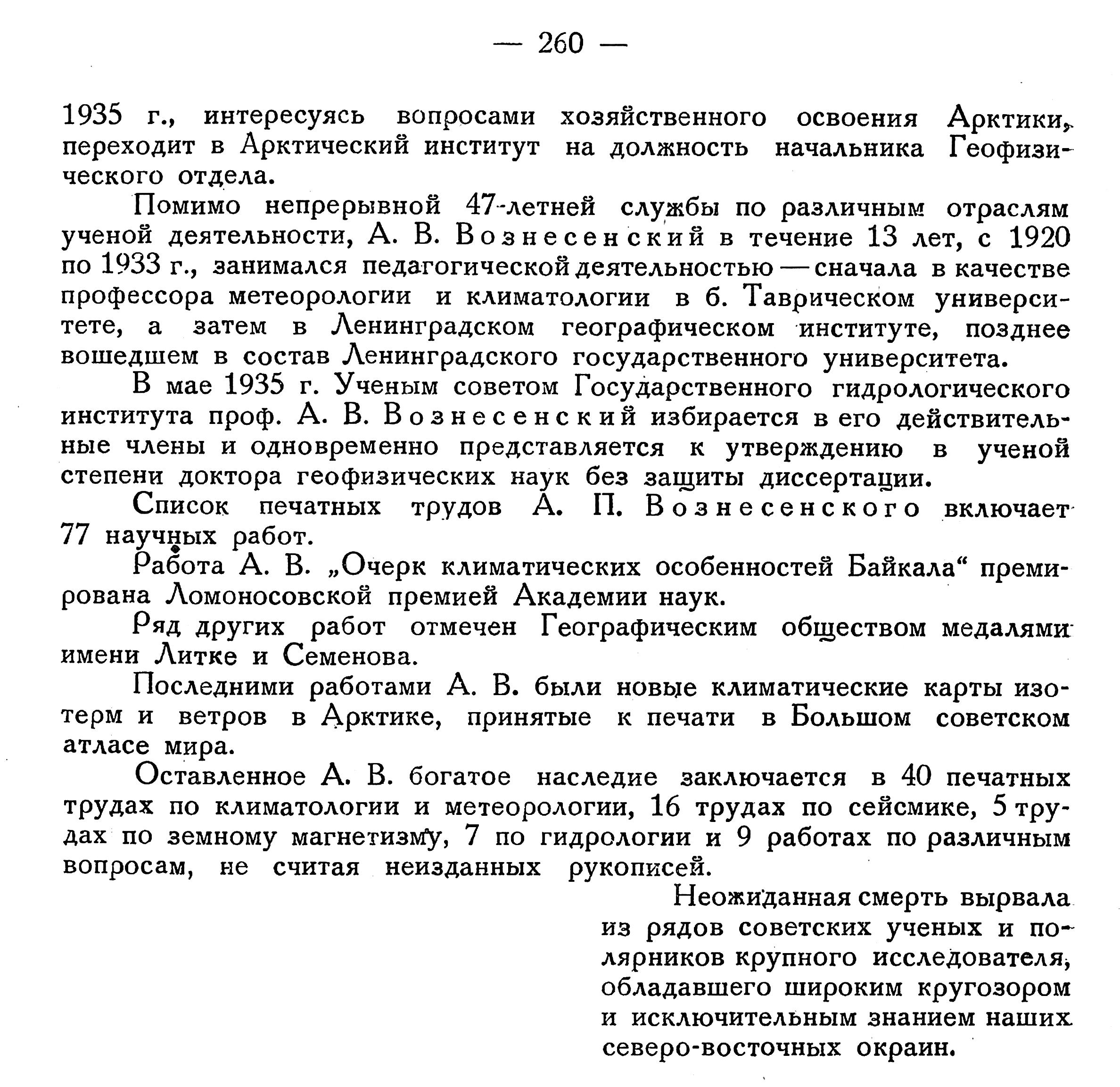В мае 1935 г. Ученым советом Государственного гидрологического института проф. А. В. Вознесенский избирается в его действительные члены и одновременно представляется к утверждению в ученой степени доктора геофизических наук без защиты диссертации.