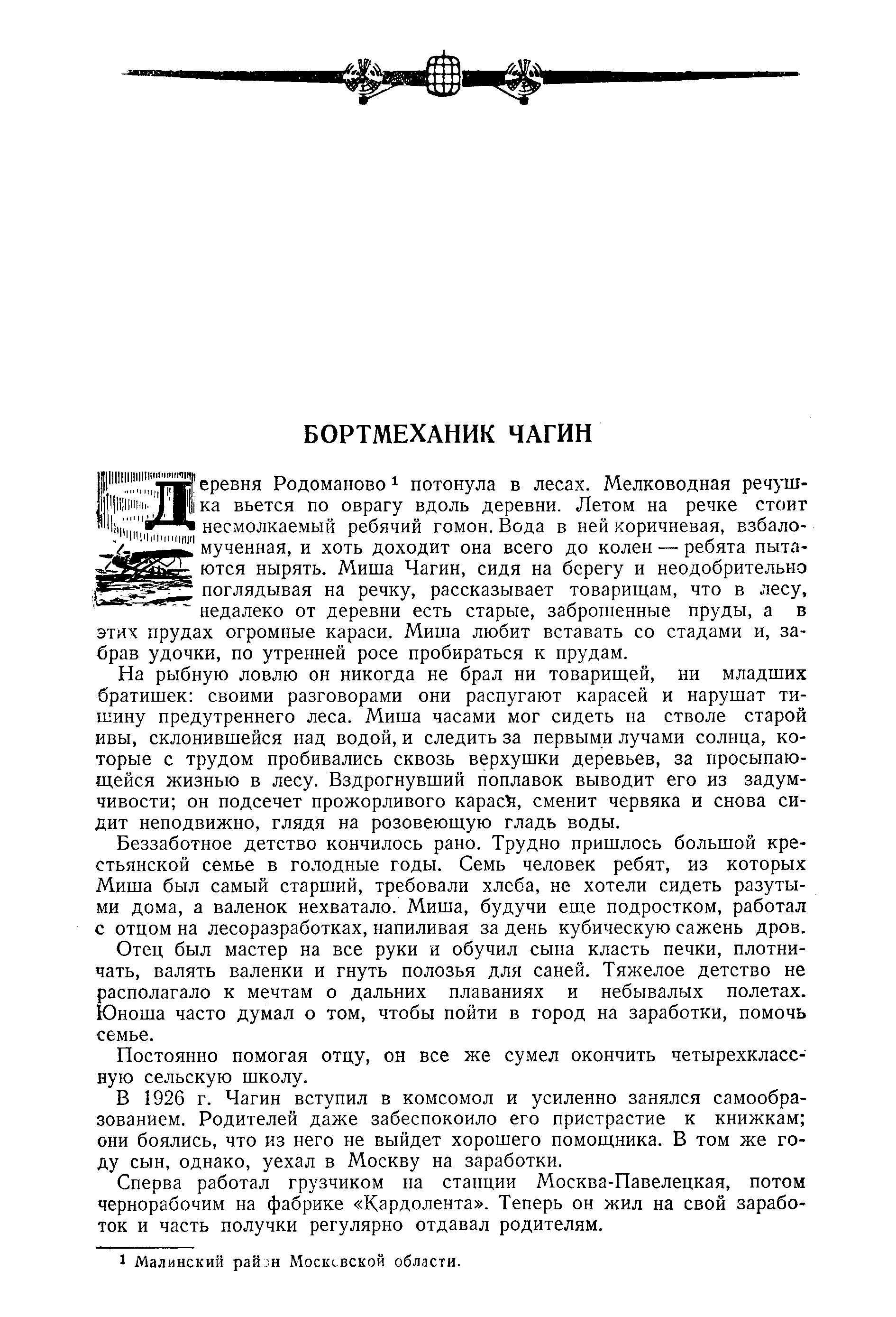 Авиация сразу понравилась Чагину. Первый полет он совершил после окончания школы авиамотористов. И странное дело — ему показалось, что бортмехаником быть гораздо интереснее и труднее, чем летчиком. Готовить моторы к полету и следить за ними в воздухе, прислушиваться к мерному ритму их работы, — все это очень привлекало Чагина.
