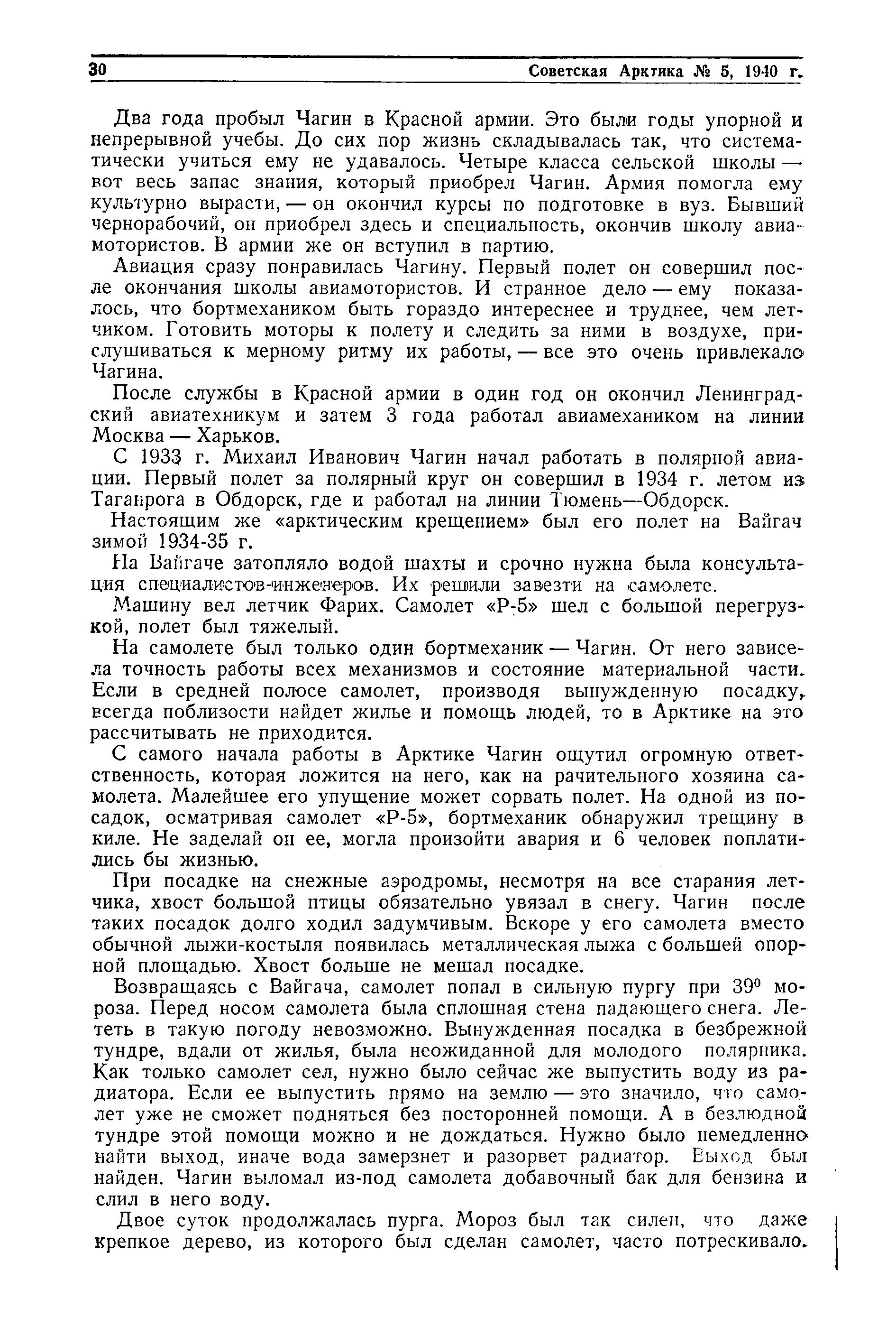 С 1933 г. Михаил Иванович Чагин начал работать в полярной авиации. Первый полет за полярный круг он совершил в 1934 г. летом из Таганрога в Обдорск, где и работал на линии Тюмень — Обдорск.