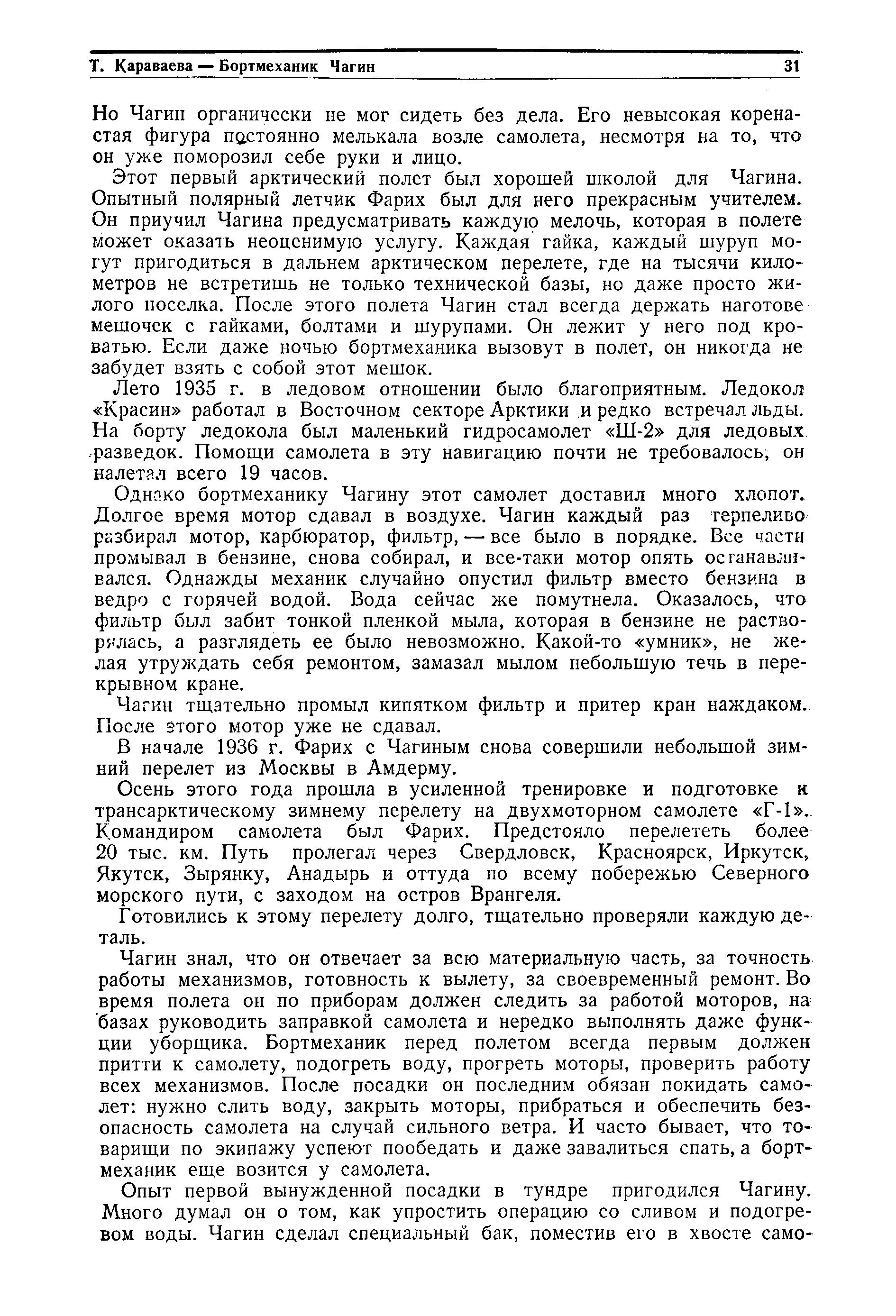 Чагин знал, что он отвечает за всю материальную часть, за точность работы механизмов, готовность к вылету, за своевременный ремонт. Во время полета он по приборам должен следить за работой моторов, на базах руководить заправкой самолета и нередко выполнять даже функции уборщика. Бортмеханик перед полетом всегда первым должен притти к самолету, подогреть воду, прогреть моторы, проверить работу всех механизмов. После посадки он последним обязан покидать самолет: нужно слить воду, закрыть моторы, прибраться и обеспечить безопасность самолета на случай сильного ветра. И часто бывает, что товарищи по экипажу успеют пообедать и даже завалиться спать, а бортмеханик еще возится у самолета.