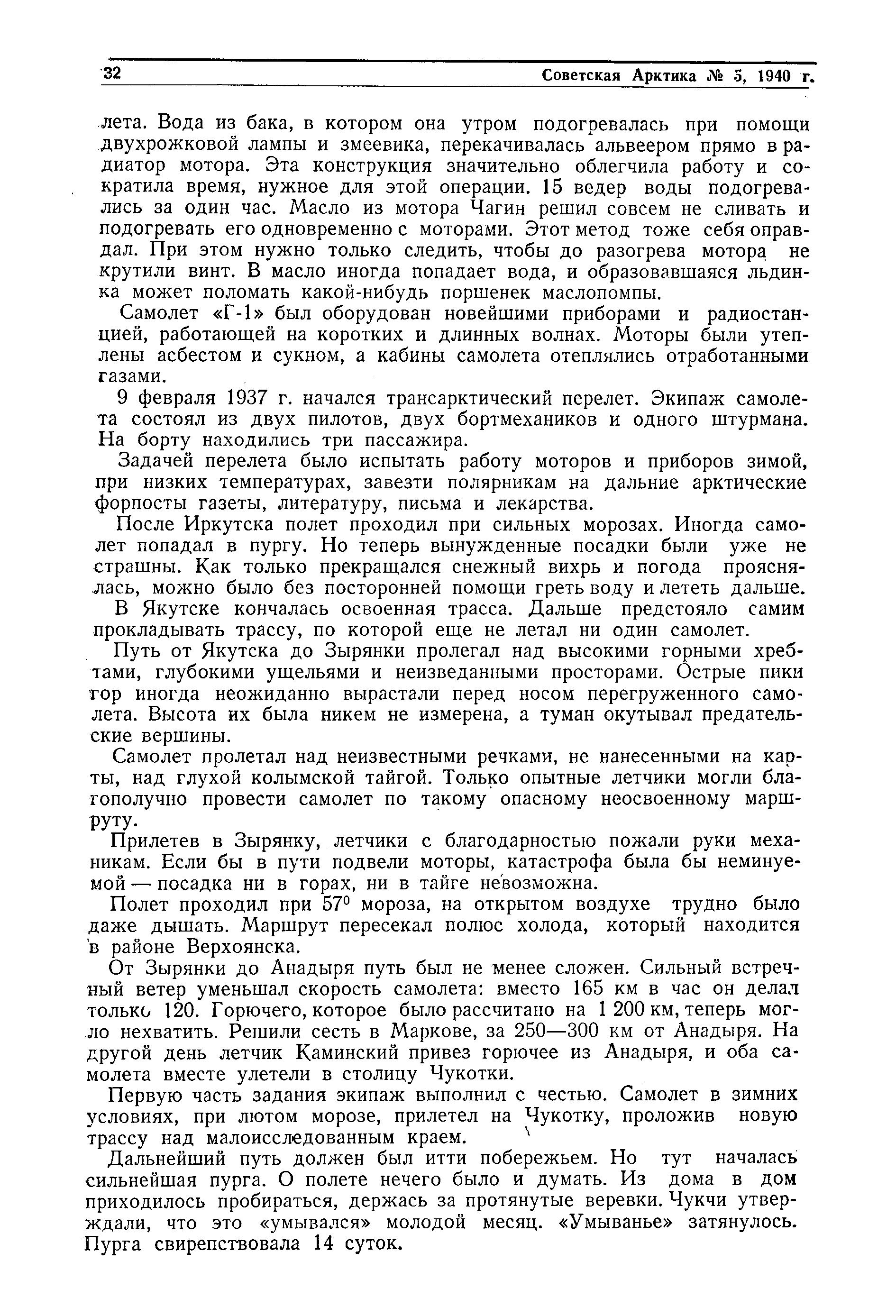 После Иркутска полет проходил при сильных морозах. Иногда самолет попадал в пургу. Но теперь вынужденные посадки были уже не страшны. Как только прекращался снежный вихрь и погода прояснялась, можно было без посторонней помощи греть воду и лететь дальше.
