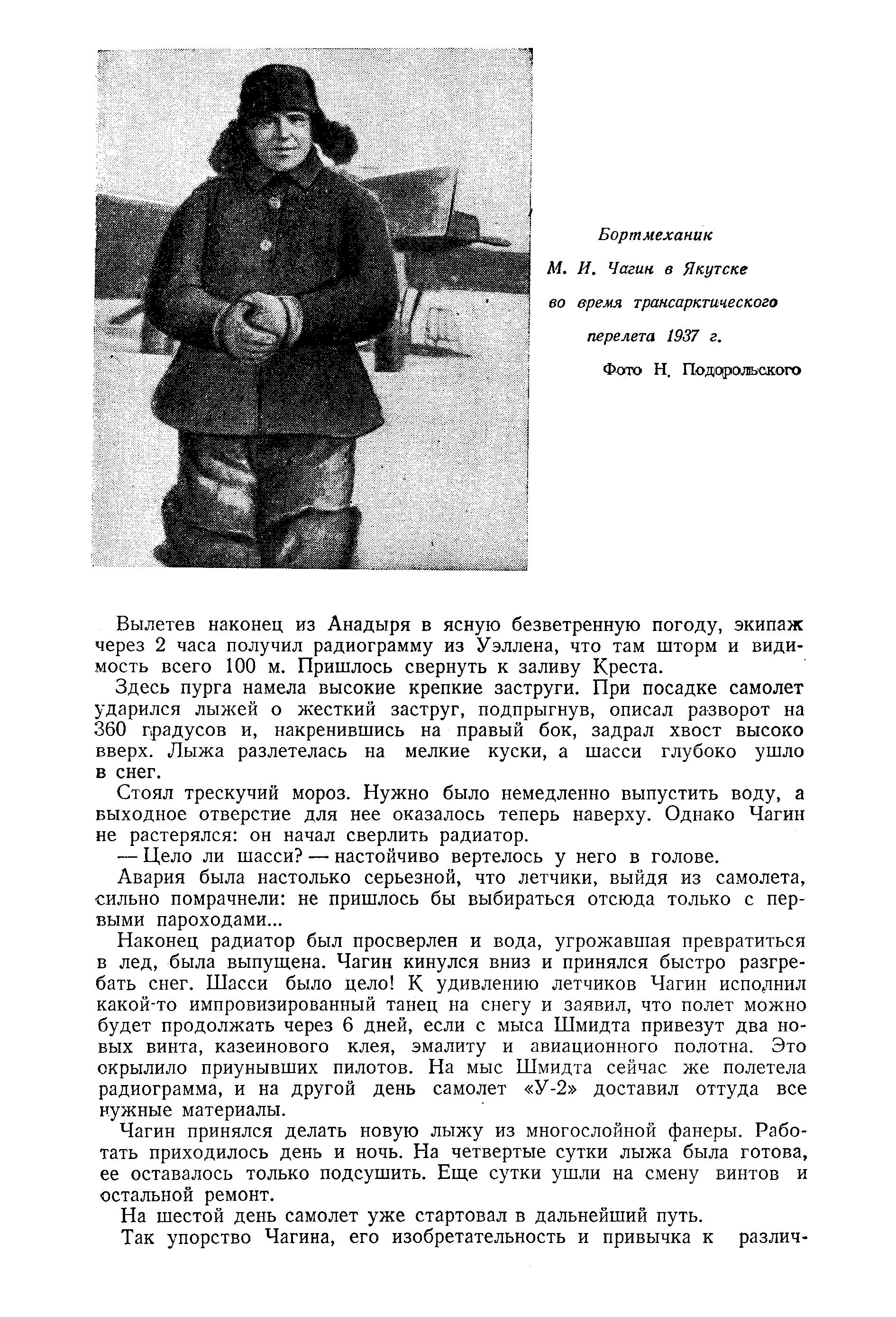 И не раз скрашивала наши нелегкие трудовые будни веселая шутка, остроумная выдумка изобретательного Чагина - старейшего бортмеханика, участника первых высокоширотных экспедиций к Северному полюсу, участника первой антарктической экспедиции, аса полярного неба.