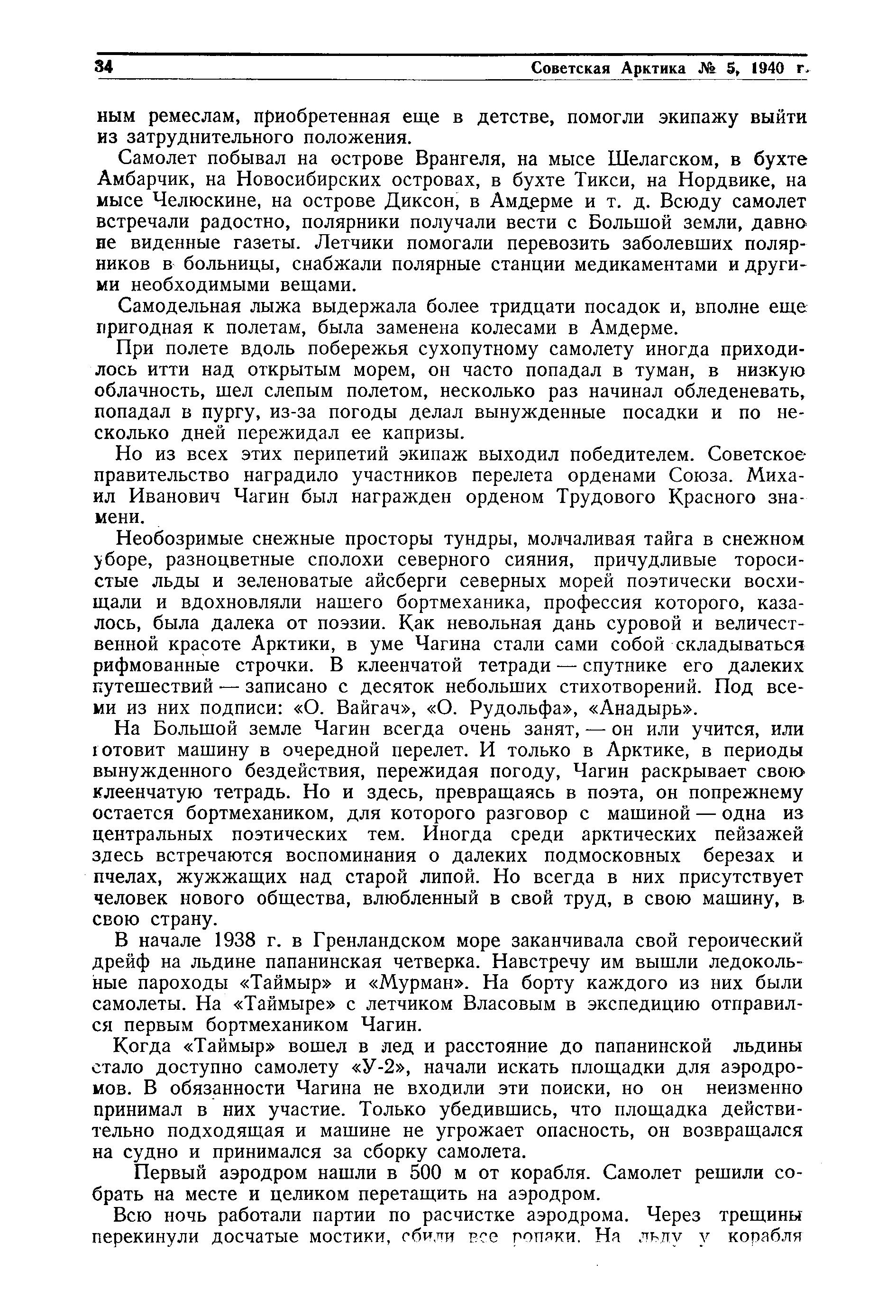 Необозримые снежные просторы тундры, молчаливая тайга в снежном }боре, разноцветные сполохи северного сияния, причудливые торосистые льды и зеленоватые айсберги северных морей поэтически восхищали и вдохновляли нашего бортмеханика, профессия которого, казалось, была далека от поэзии. Как невольная дань суровой и величественной красоте Арктики, в уме Чагина стали сами собой складываться рифмованные строчки. В клеенчатой тетради — спутнике его далеких путешествий — записано с десяток небольших стихотворений. Под всеми из них подписи: «О. Вайгач», «О. Рудольфа», «Анадырь».