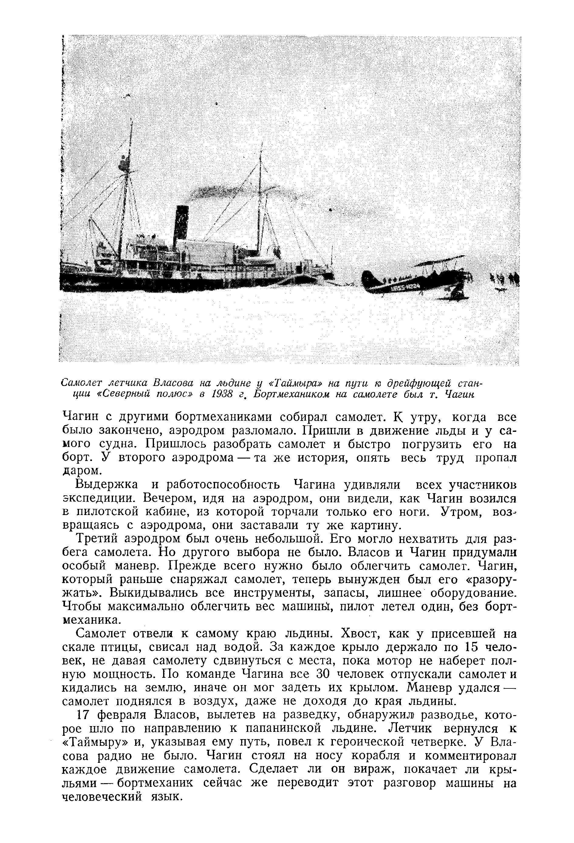 Когда «Таймыр» вошел в лед и расстояние до папанинской льдины стало доступно самолету «У-2», начали искать площадки для аэродромов. В обязанности Чагина не входили эти поиски, но он неизменно принимал в них участие. Только убедившись, что площадка действительно подходящая и машине не угрожает опасность, он возвращался на судно и принимался за сборку самолета.