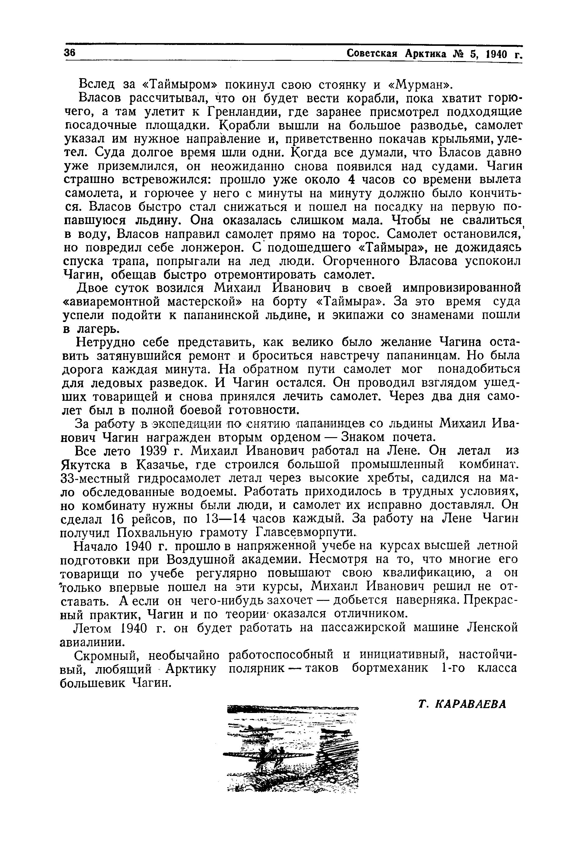 В начале 1938 г. в Гренландском море заканчивала свой героический дрейф на льдине Папанинская четверка. Навстречу им вышли ледокольные пароходы «Таймыр» и «Мурман». На борту каждого из них были самолеты. На «Таймыре» с летчиком Власовым в экспедицию отправился первым бортмехаником Чагин.