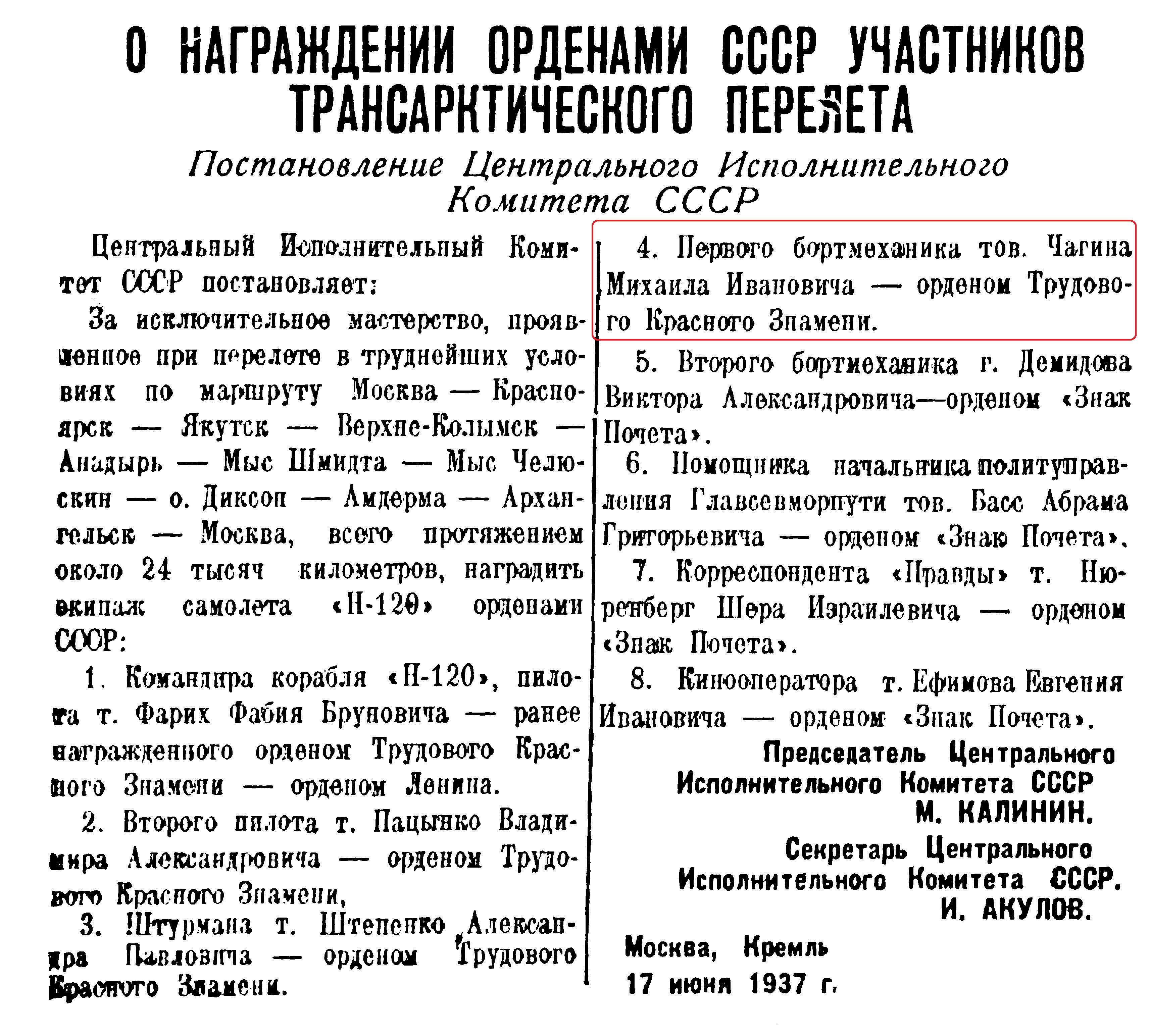 Но из всех этих перипетий экипаж выходил победителем. Советское правительство наградило участников перелета орденами Союза. Михаил Иванович Чагин был награжден орденом Трудового Красного знамени.
