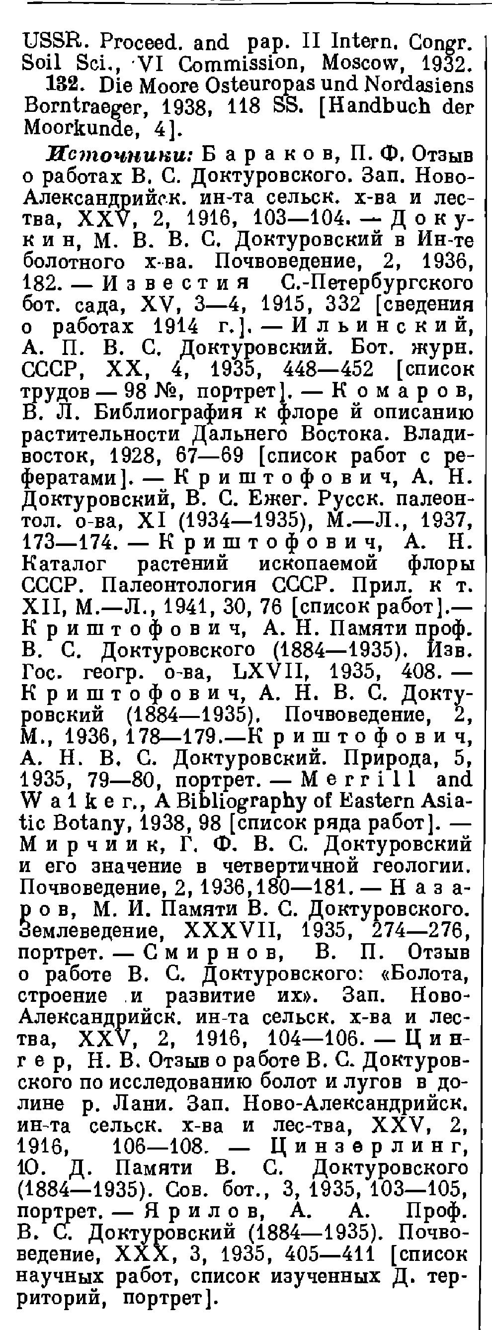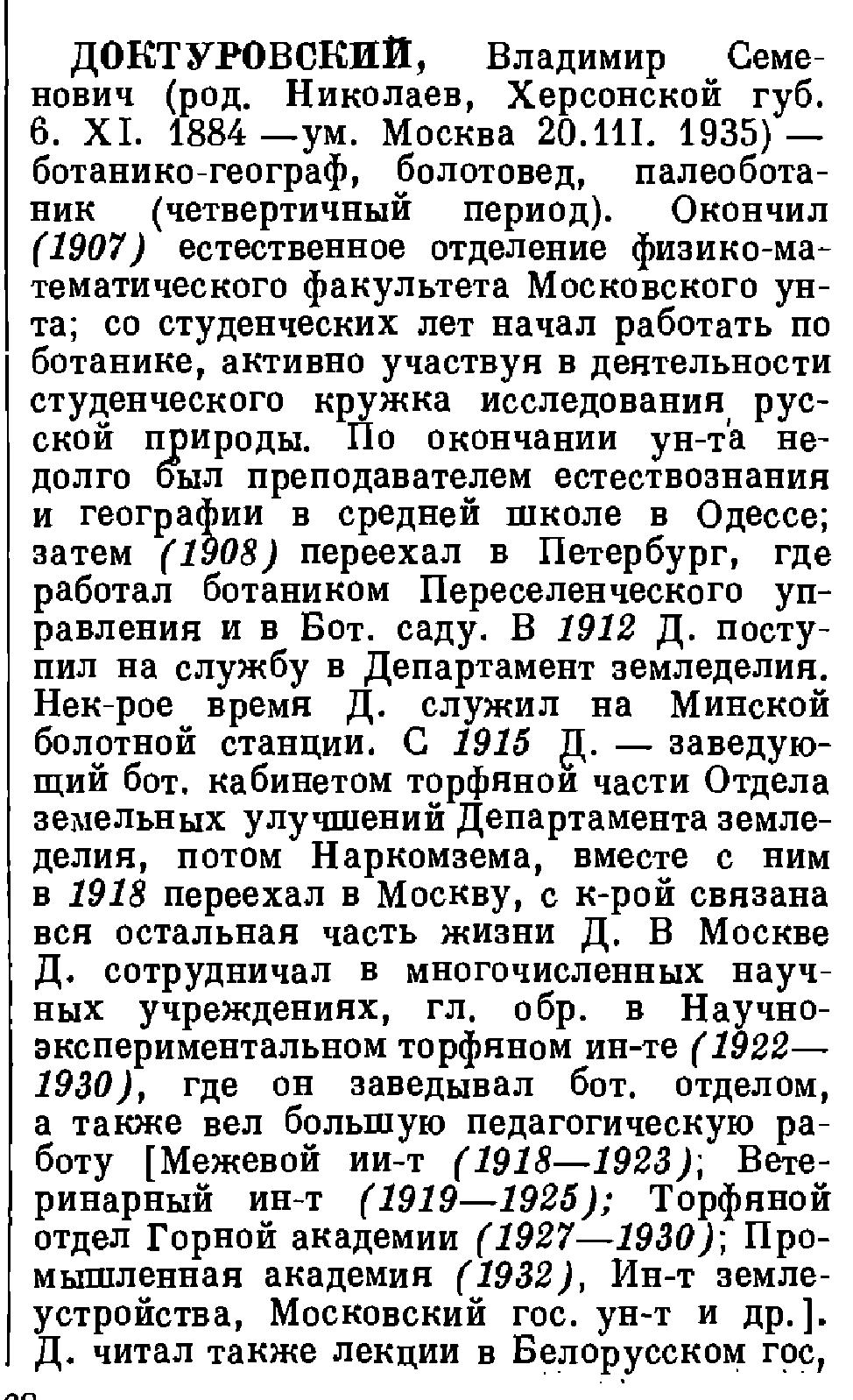 ДОКТУРОВСКИЙ, Владимир Семенович (род. Николаев, Херсонской губ. 6. XI. 1884 —ум. Москва 20. 11. 1935) — ботанико-географ, болотовед, палеоботаник (четвертичный период). Окончил (1907) естественное отделение физико-математического факультета Московского ун-та; со студенческих лет начал работать по ботанике, активно участвуя в деятельности студенческого кружка исследования русской природы. По окончании ун-та недолго был преподавателем естествознания и географии в средней школе в Одессе; затем (1908) переехал в Петербург, где работал ботаником Переселенческого управления и в Бот. саду. В 1912 Д. поступил на службу в Департамент земледелия. Нек-рое время Д. служил на Минской болотной станции. С 1915 — заведующий бот. кабинетом торфяной части Отдела земельных улучшений Департамента земледелия, потом Наркомзема, вместе с ним в 1918 переехал в Москву, с к-рой связана вся остальная часть жизни Д. В Москве Д. сотрудничал в многочисленных научных учреждениях, гл. обр. в Научно-экспериментальном торфяном ин-те (1922—1930), где он заведывал бот. отделом, а также вел большую педагогическую работу [Межевой ин-т (1918—1923); Ветеринарный ин-т (1919—1925); Торфяной отдел Горной академии (1927—1930); Промышленная академия (1932), Ин-т землеустройства, Московский гос. ун-т и др.]. Д. читал также лекции в Белорусском гос. ун-те, — Д. — пионер развитии в России болотоведения; региональными исследованиями болот и торфяников он всецело занимался с 1912—1913 до конца своей жизни, уделяя им внимание и ранее. В области болотоведения Д. опубликовал множество трудов, посвященных описаниям растительности болот и торфяников различных территорий Союза, с к-рыми он имел возможность ознакомиться во время своих многочисленных экспедиций и экскурсий по России и за границей. Полевая деятельность Д. — огромна; им исследованы: 1904 — Минская губ., 1906 — Средний Урал, 1907 — Абхазия, 1908 — лесостепная часть Херсонской губ., 1908—1909 — Амурская обл., 1912—1914 — Минская и Волынская губ., 1917 — Петроградская и Псковская губ., 1919—1920 — Московская и Владимирская губ., 1921 — Архангельская и Вологодская губ., 1922 — Центральная часть РСФСР, 1923 — Вологодская, Пензенская и Орловская губ., 1924 — Кольский п-ов, 1925—1926 —Нижегородская губ., Урал, Белорусская ССР, 1927 — Ленинградская обл. и др., 1929 — Закавказье, Московская обл., 1930 — Архангельская обл., Белорусская ССР, Московская обл., 1931 — Барабинская степь и Закавказье, Костромской край, Западная обл., 1932 — Тюменский р-н Западной Сибири, 1933 —Московская обл., 1934 — Белорусская ССР, Верхняя Волга и др. — Д. посетил Японию (1908), Финляндию (1910), Швецию (1925, 1929), Норвегию (1925), Германию (1928—1929), Чехословакию (1928), Польшу (1928—1929). Д. был участником IV и V Международных бот.-географических экскурсий по Швеции и Норвегии, Чехословакии и Польше и членом Комитета по организации международного объединения исследователей болот. Д. состоял председателем Комиссии по изучению болот при Международной ассоциации почвоведов. За региональные исследования болот и торфяников Д. была (1924) присуждена золотая медаль Русского географического о-ва. Д. — усиленно занимался историей развития растительного покрова СССР в четвертичном периоде па основании пыльцевого анализа торфов и был одним из пионеров применения «пыльцевого метода» в СССР, большое число публикаций Д. посвящено вопросам стратиграфии болот, «пограничного гориз