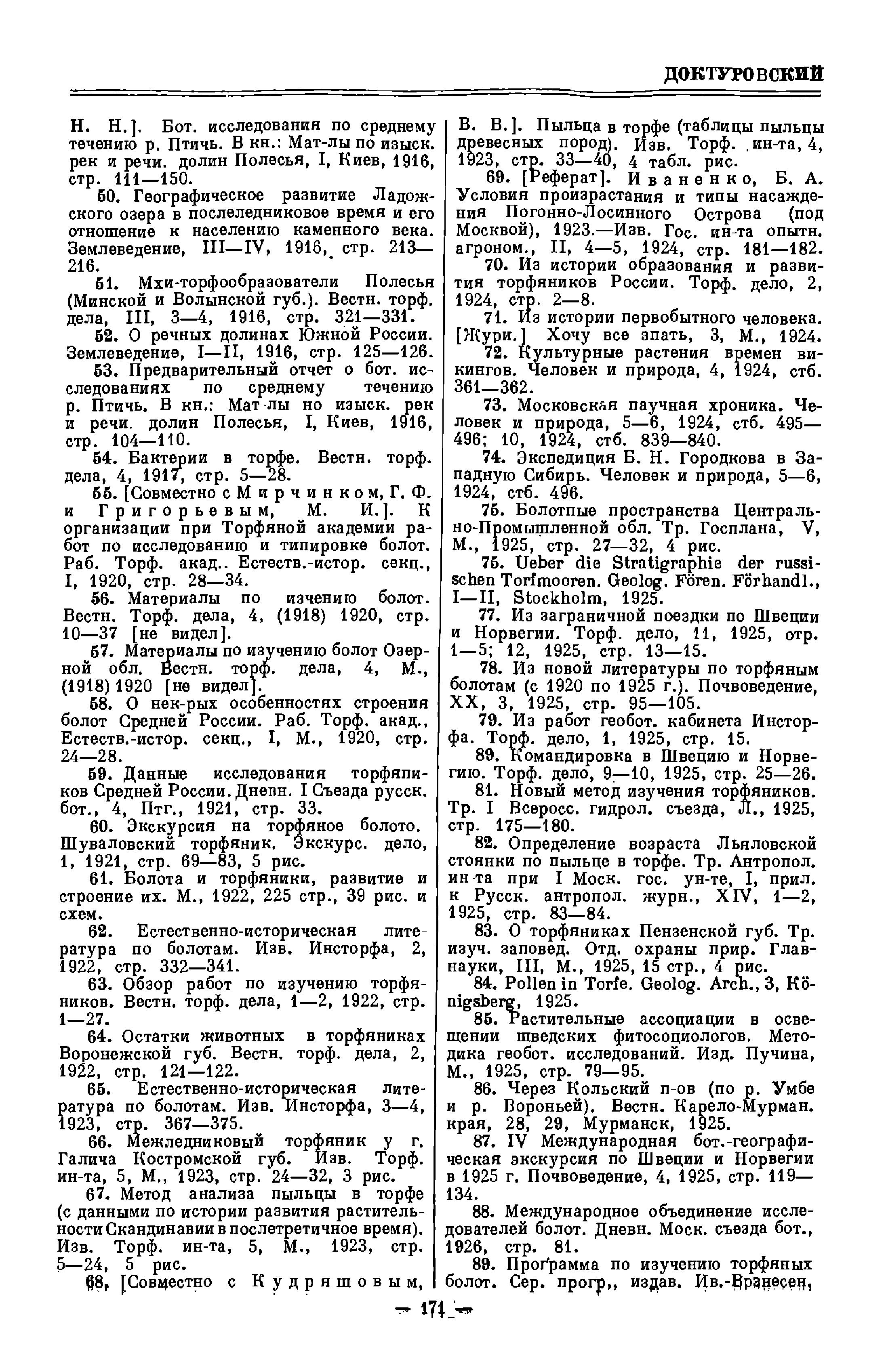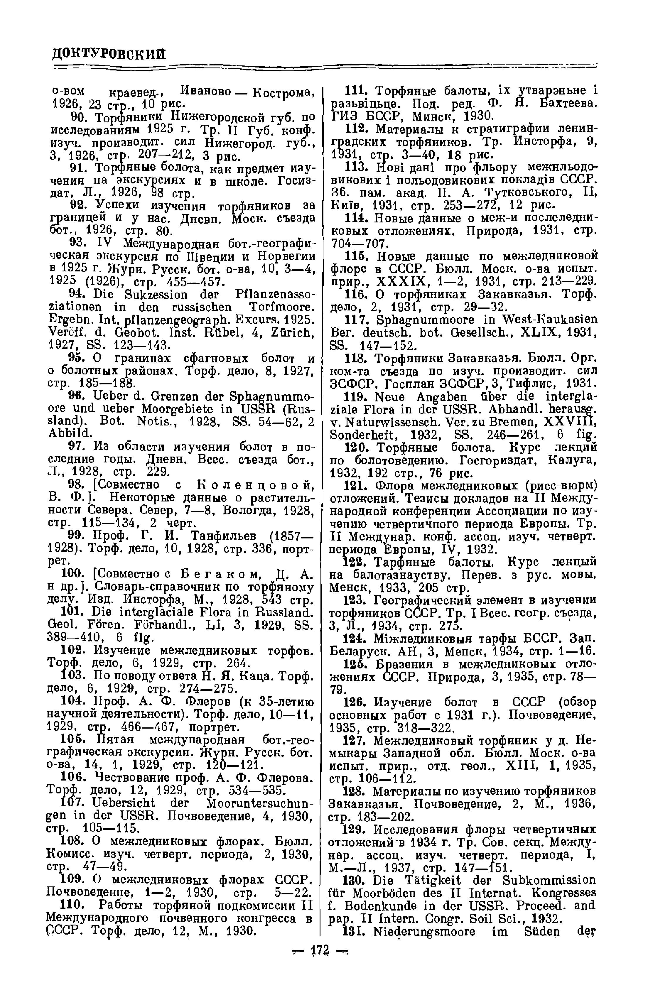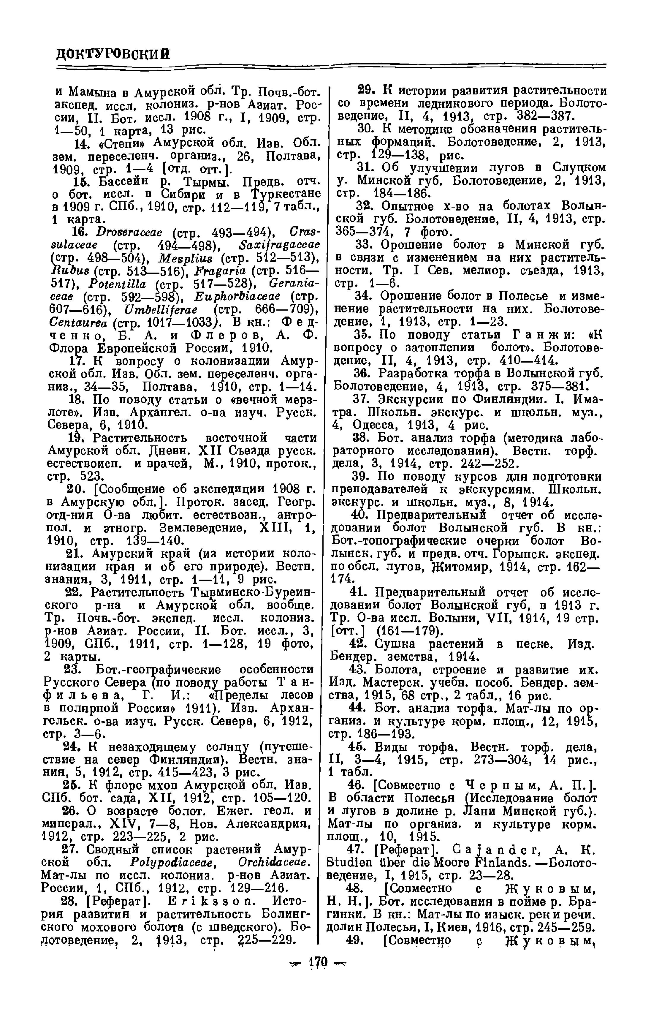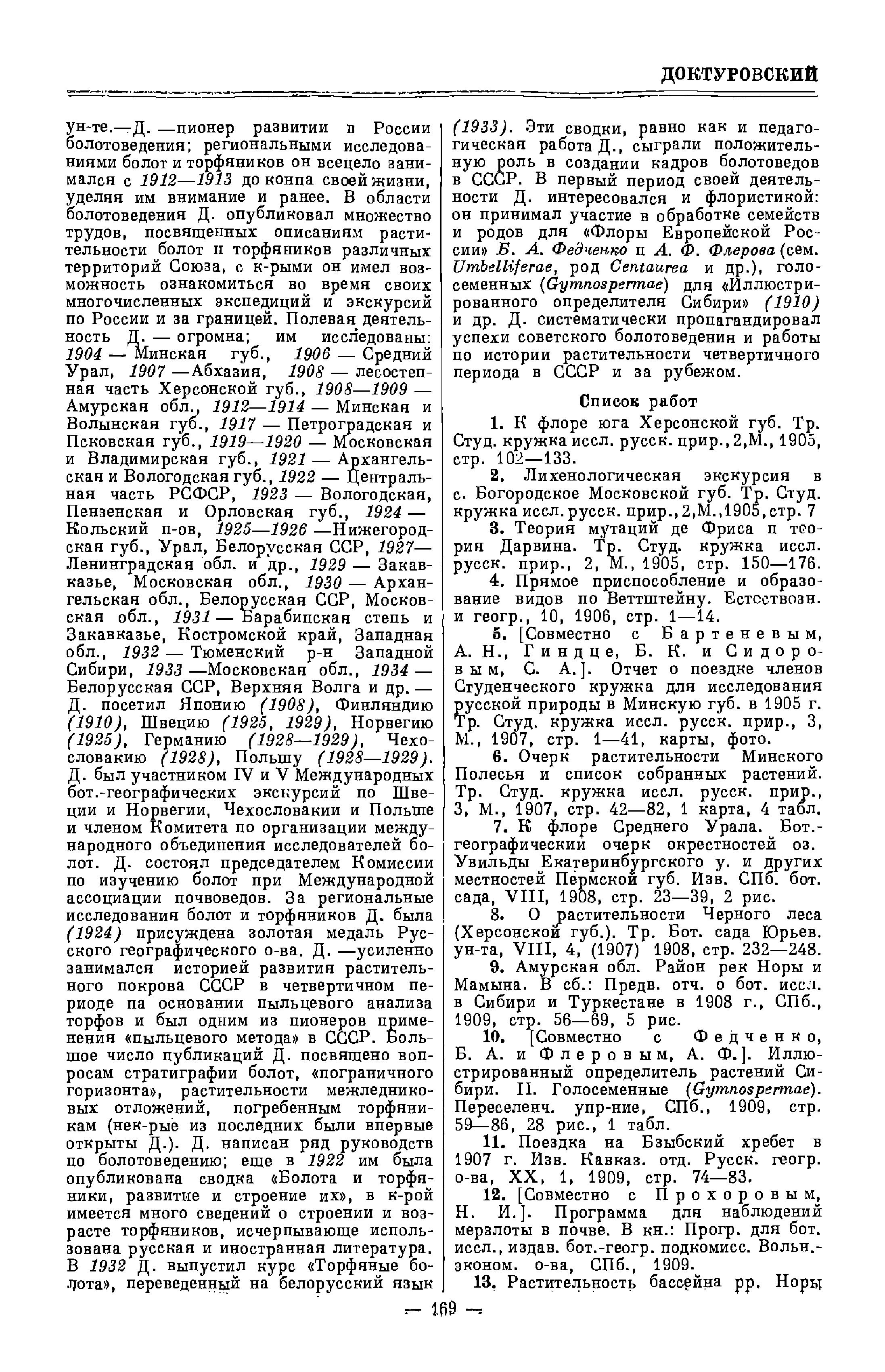 (1933). Эти сводки, равно как и педагогическая работа Д., сыграли положительную роль в создании кадров болотоведов в СССР. В первый период своей деятельности Д. интересовался и флористикой: он принимал участие в обработке семейств и родов для «Флоры Европейской России» Б. А. Федченко и А. Ф. Флерова (сем. Umbelliferae, род Centaurea и др. ), голосеменных (Gymnospermae) для «Иллюстрированного определителя Сибири» (1910) и др. Д. систематически пропагандировал успехи советского болотоведения и работы по истории растительности четвертичного периода в СССР и за рубежом.