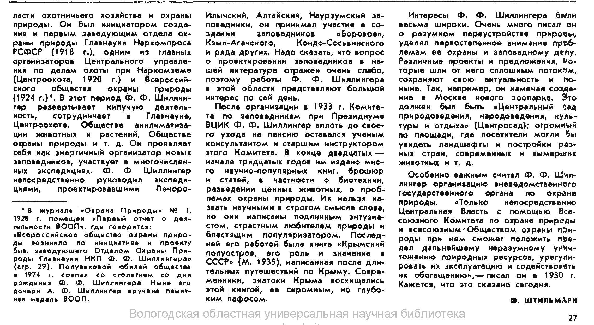 4 В журнала «Охрана Природы» № 1, 1928 г. помещен «Первый отчет о деятельности ВООП», где говорится: «Всероссийское общество охраны природы возникло по инициативе и проекту быв. заведующего Отделом Охраны Природы Главнауки НКП Ф. Ф. Шиллингера» (стр. 29). Полувековой юбилей общества в 1974 г. совпал со столетием со дня рождения Ф. Ф. Шиллингера. Ныне его дочери А. Ф. Шиллингер вручена памятная медаль ВООП.