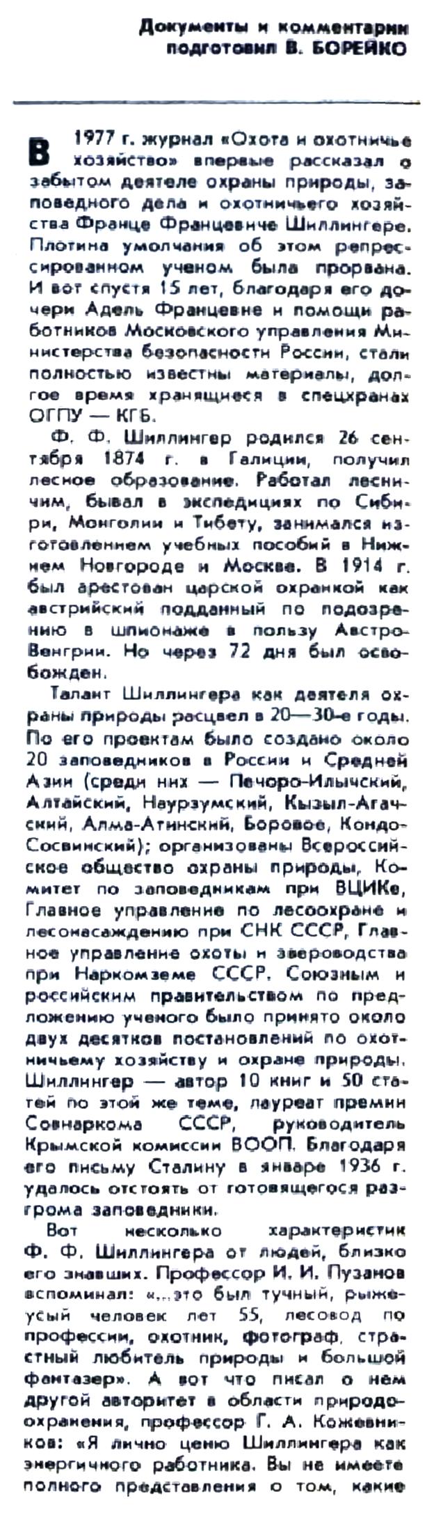 В 1977 г. журнал "Охота и охотничье хозяйство" впервые рассказал о забытом деятеле охраны природы, заповедного дела и охотничьего хозяйства Франце Францевиче Шиллингере. Плотина умолчания об этом репрессированном ученом была прорвана. И вот спустя 15 лет, благодаря его дочери Адель Францевне и помощи работников Московского управления Министерства безопасности России, стали полностью известны материалы, долгое время хранящиеся в спецхранах ОГПУ — КГБ.