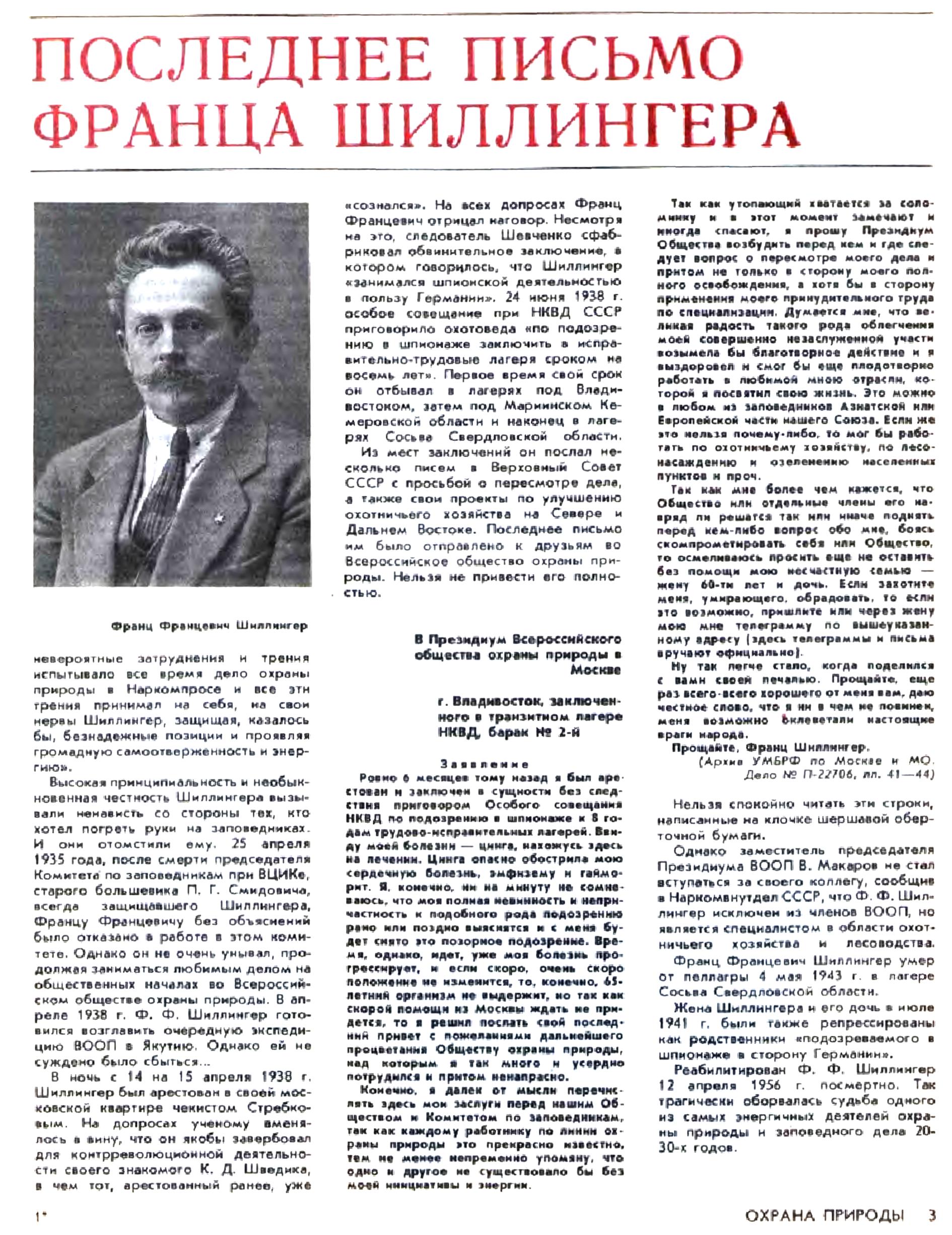 В архиве Академии наук СССР, в личном фонде академика Кулагина, одного из активнейших защитников природы, я наткнулся на пачку больших. в клеточку, листков. Это было письмо Франца Францевича Шиллингера академику Николаю Михайловичу Кулагину. Пробежав первые страницы, я понял, что в мои руки попал уникальный исторический документ. Это была исповедь. Вопль о помощи. Соломинка, за которую хватается утопающий. Вот отрывки из письма.