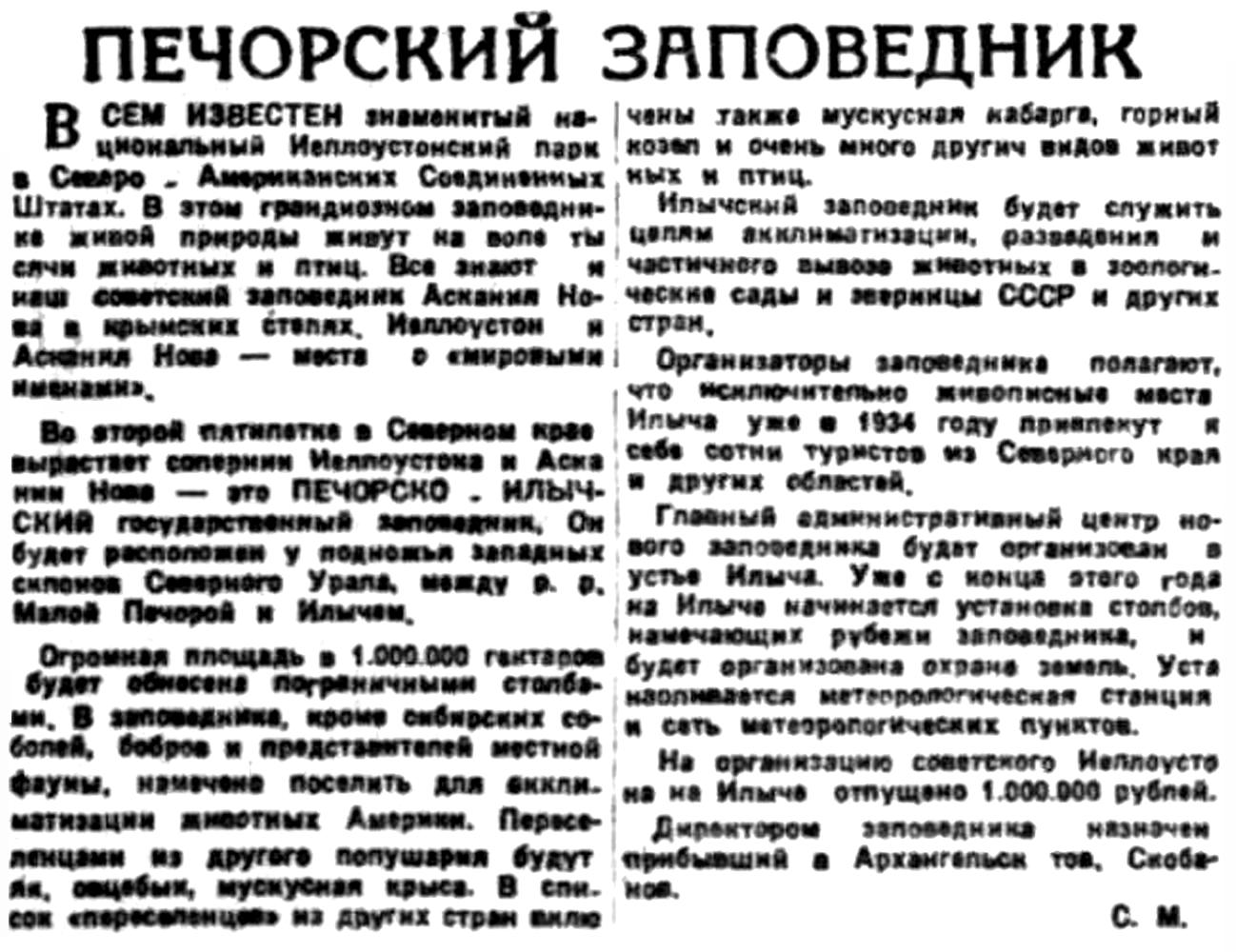 Во второй пятилетке в Северном крае вырастает соперник Иеллоустона и Аскания Нова — это ПЕЧОРСКО-ИЛЫЧСКИЙ государственный заповедник. Он будет расположен у подножья западных склонов Северного Урала, между р. р. Малой Печорой и Илычем.