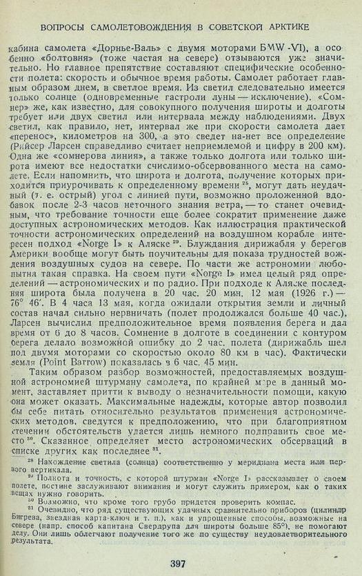 ВОПРОСЫ САМОЛЕТОВОЖДЕНИЯ В СОВЕТСКОЙ АРКТИКЕкабина самолета "Дорнье-Валь" с двумя моторами BMW-V1), а особенно "болтовня" (тоже частая на севере) отзываются уже значительно. Но главное препятствие составляют специфические особенности полета: скорость и обычное время работы. Самолет работает главным образом днем, в светлое время. Из светил следовательно имеется только солнце (одновременные гастроли луны — исключение). "Сомнер" же, как известно, для совокупного получения широты и долготы требует или двух светил или интервала между наблюдениями. Двух светил, как правило, нет, интервал же при скорости самолета дает "перенос", километров на 300, а это сведет на-нет все определение (Рийсер Ларсен справедливо считает неприемлемой и цифру в 200 км). Одна же "сомнерова линия", а также только долгота или только широта имеют все недостатки счислимо-обсервованного места на самолете. Если напомнить, что широта и долгота, получение которых приходится приурочивать к определенному времени