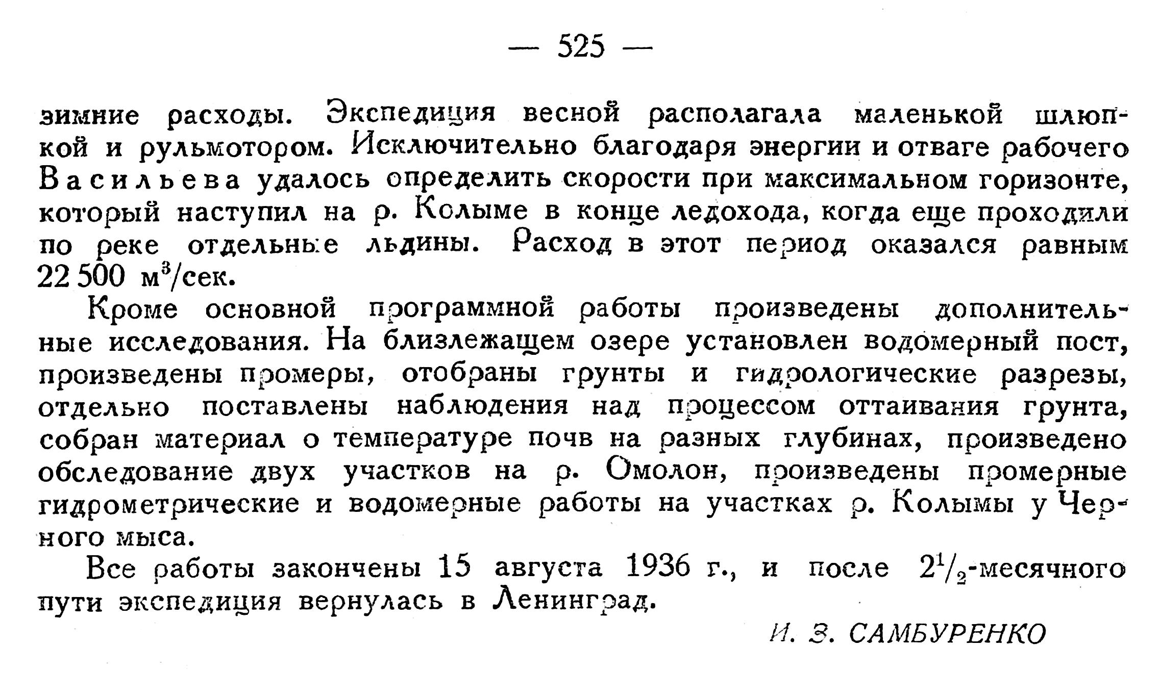 25 июля 1935 г. на п/х "Рабочий" выехала на р. Колыму экспедиция Арктического института в составе начальника экспедиции И. З. Самбуренко, помощника И. Л. Мукина, техника-гидролога Л. И. Чумака, моториста А. Н. Черенова и рабочего Д. Ф. Васильева.