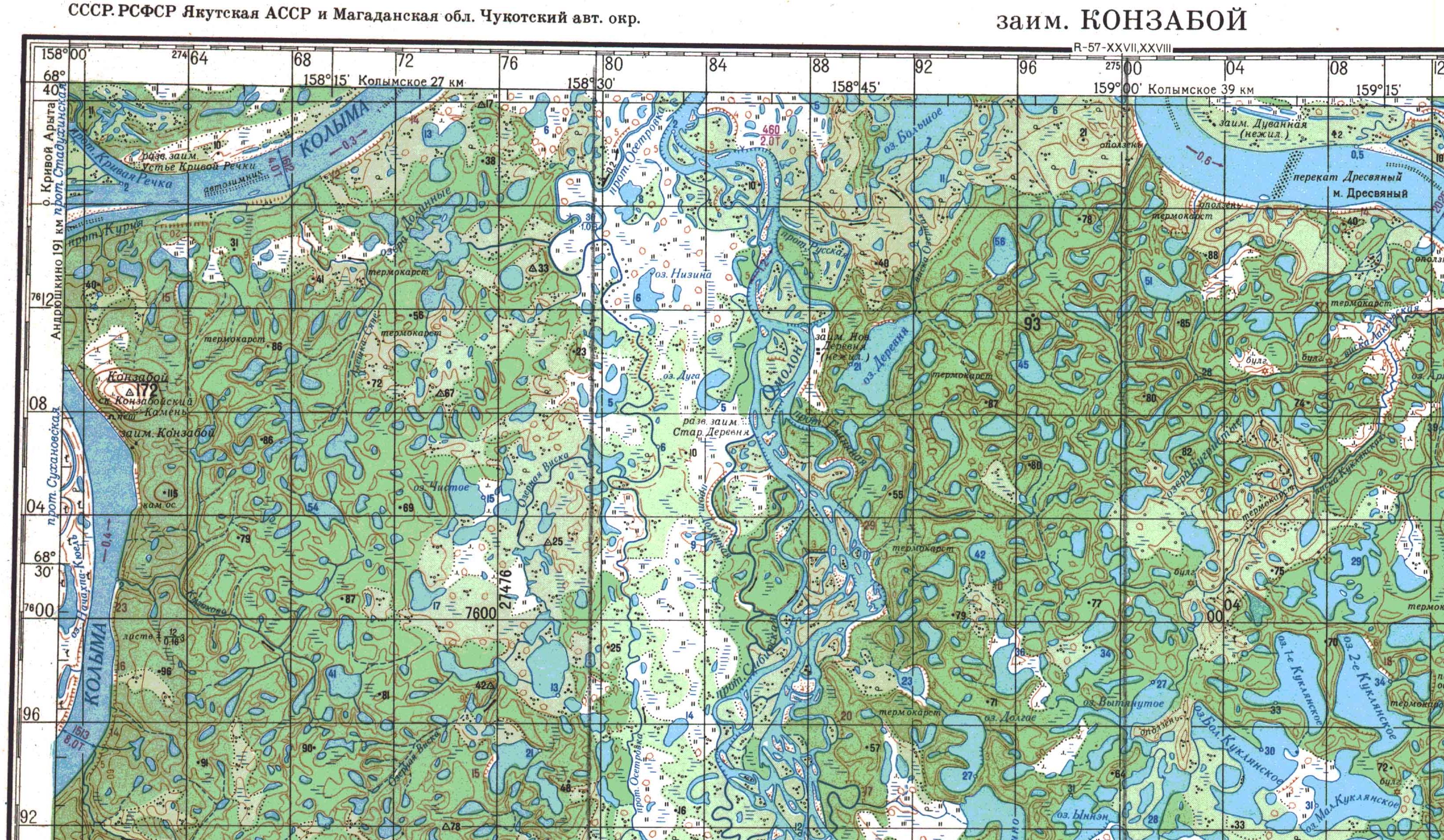Последний утес правого берега – скала Конзобой, длинная, низкая грива, которая высовывается на север в виде туши кита. Колыма поворачивает вокруг него на восток и вскоре сливается с своим самым большим притоком – Омолоном.