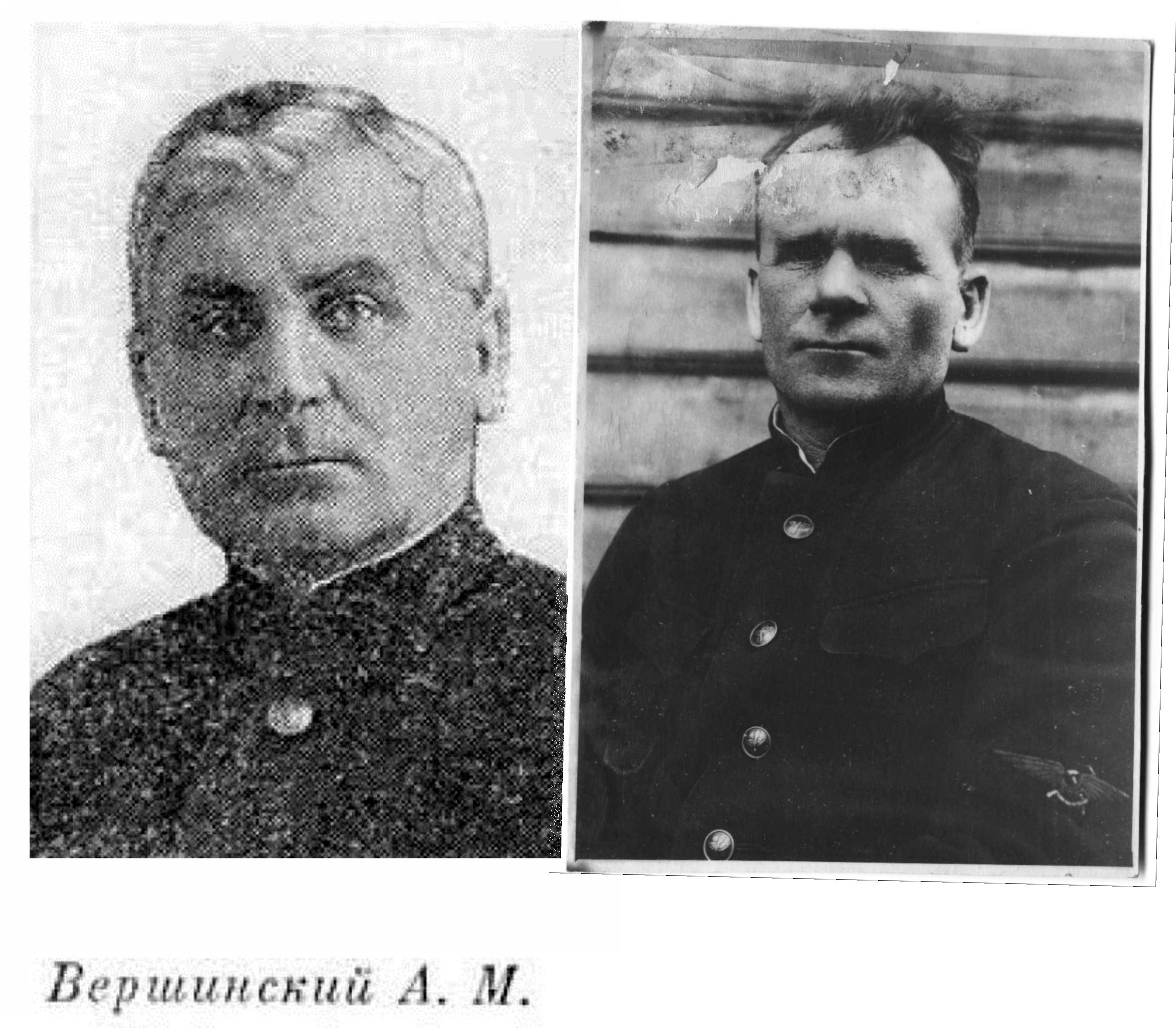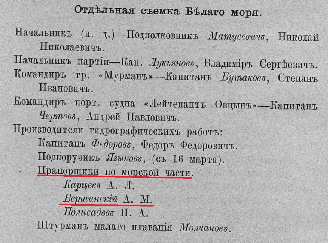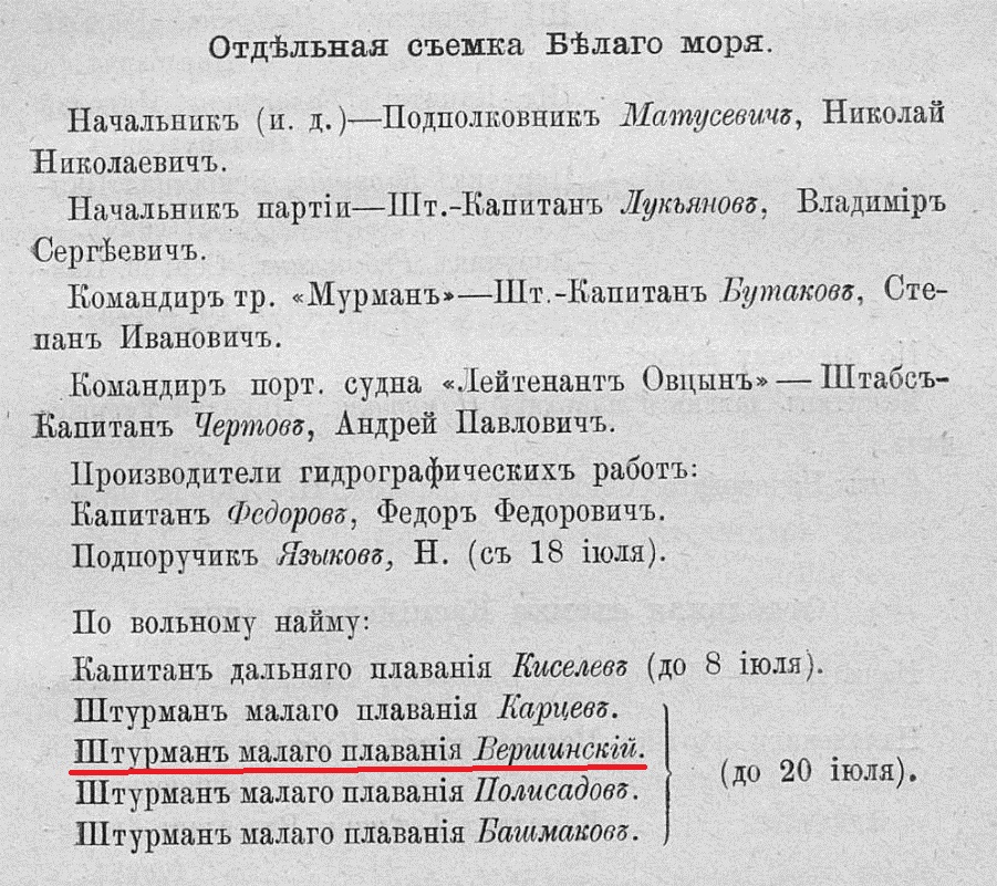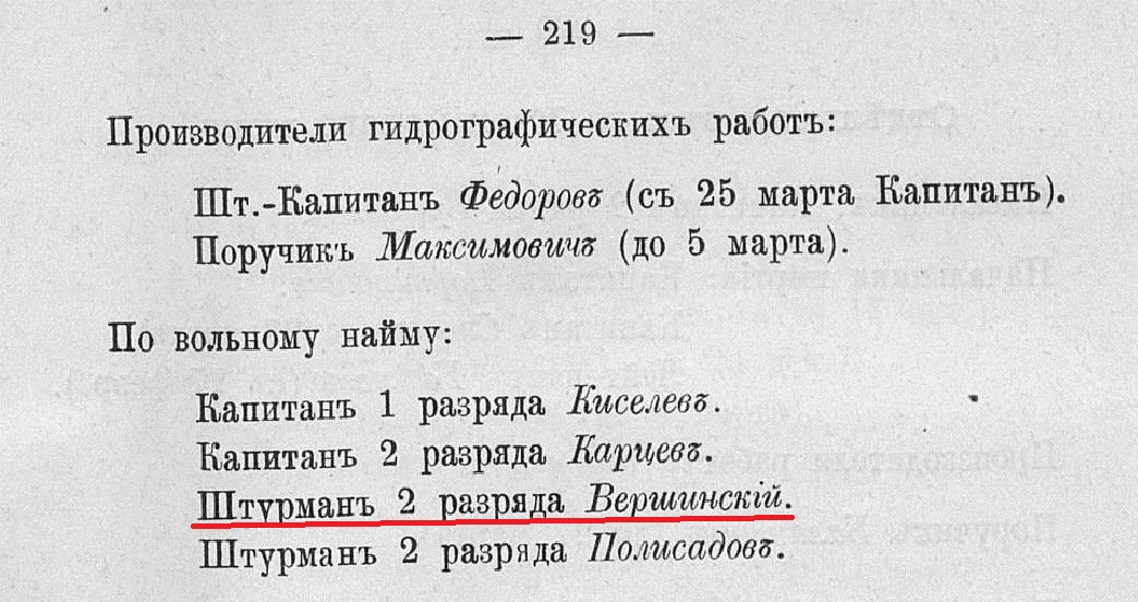 ВЕРШИНСКИЙ Александр Михайлович (1887—1942) по оконч, в 1909 г. Архангельского мореходного уч-ща плав. на судах торгового флота. В 1917—21 гг. ком. г/с «Мурман» и был нач. промерной партии в Гидр. эксп. Белого моря. В 1922 г. оконч. Военно-мор. гидр. уч-ще и вновь уч. в иссл. Арктики. В 1927—31 гг. уч. в иссл. Балт. моря. В 1932 г. ком. г/с «Таймыр» в Таймырской эксп. В 1937—38 гг., ком. г/с «Камчадал», провел его из Кронштадта СМП во Владивосток. Впоследствии работал в ГУ ВМФ. Имел звание кап. 2 р.