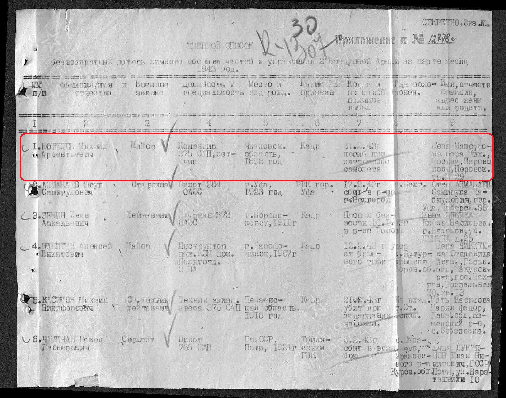 Погиб 21.02.1943 г. в авиационной катастрофе.