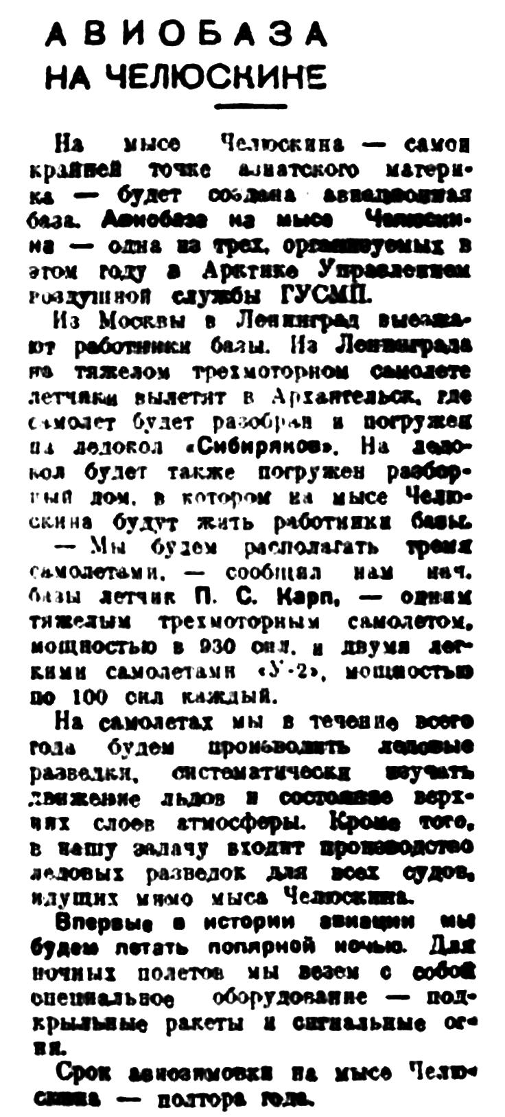 Направленный на зимовку на м. Челюскин лётный состав (тт Карп и др) не прибыли и т. Линдель остался там с 3-мя самолётами и одним механиком Игнатьевым.