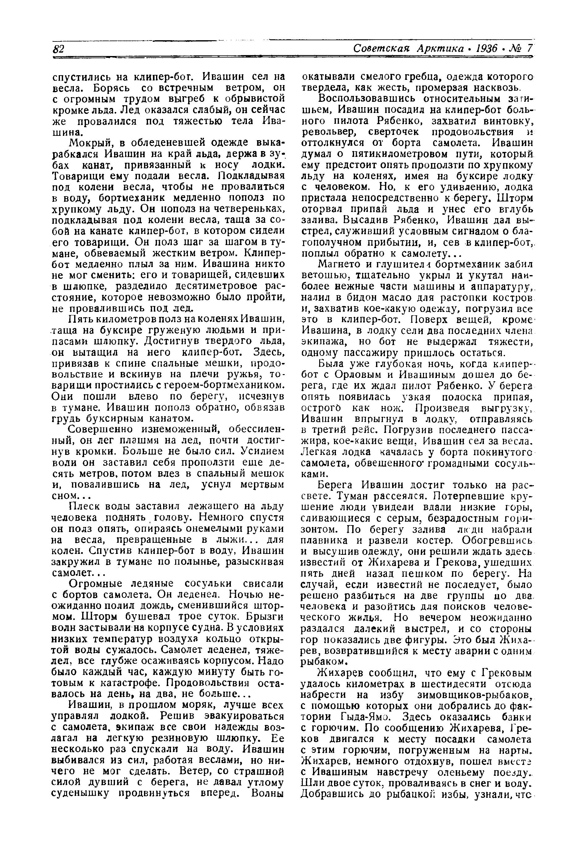 Воспользовавшись относительным затишьем, Ивашин посадил на клипер-бог больного пилота Рябенко, захватил винтовку, револьвер, сверточек продовольствия и оттолкнулся от борта самолета. Ивашин думал о пятикилометровом пути, который ему предстоит опять проползти по хрупкому льду на коленях, имея на буксире лодку с человеком. Но, к его удивлению, лодка пристала непосредственно к берегу. Шторм оторвал припай льда и унес его вглубь залива. Высадив Рябенко, Ивашин дал выстрел, служивший условным сигналом о благополучном прибытии, и, сев в клипер-бот, поплыл обратно к самолету...