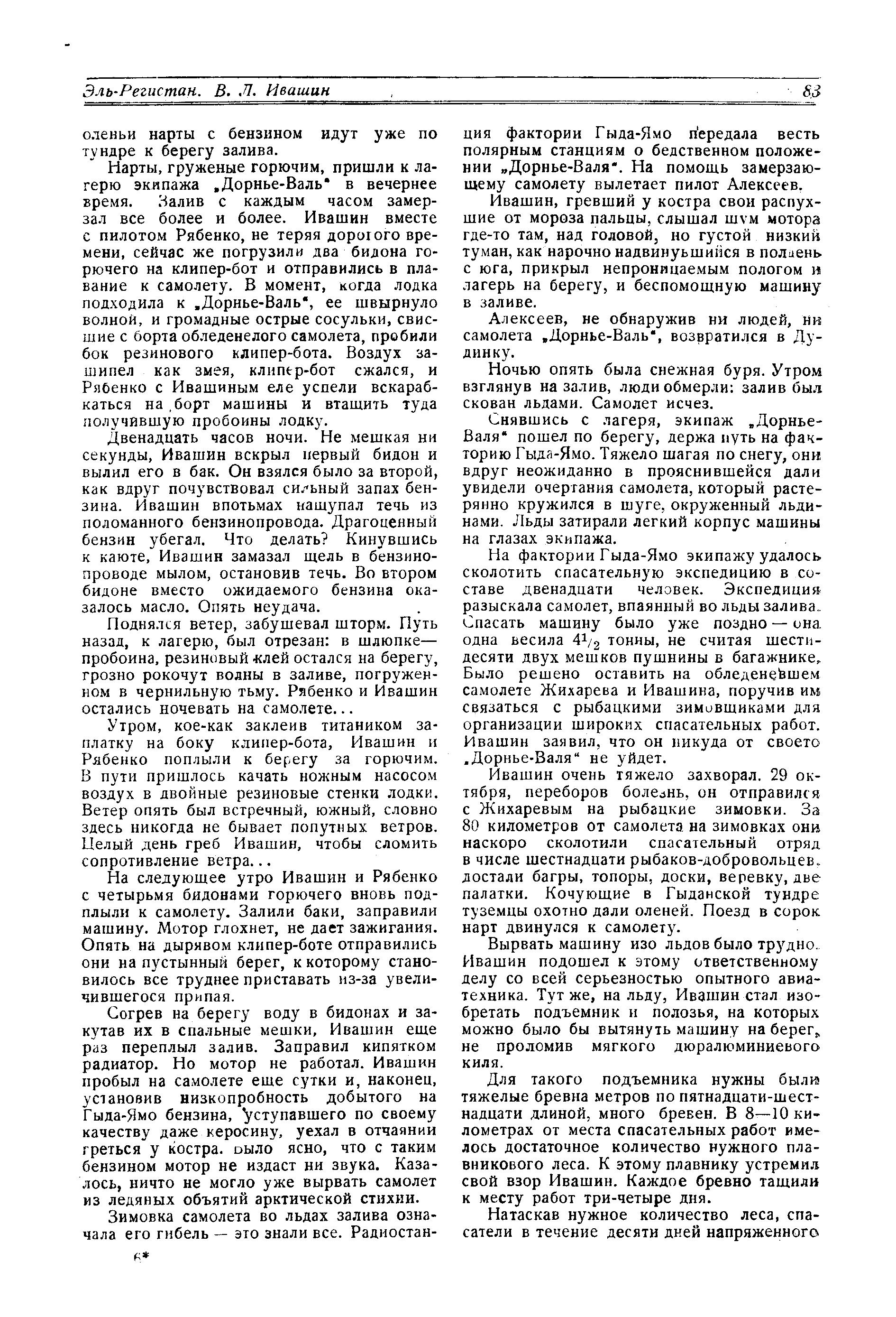 На следующее утро Ивашин и Рябенко с четырьмя бидонами горючего вновь подплыли к самолету. Залили баки, заправили машину. Мотор глохнет, не дает зажигания. Опять на дырявом клипер-боте отправились они на пустынный берег, к которому становилось все труднее приставать из-за увеличившегося припая.